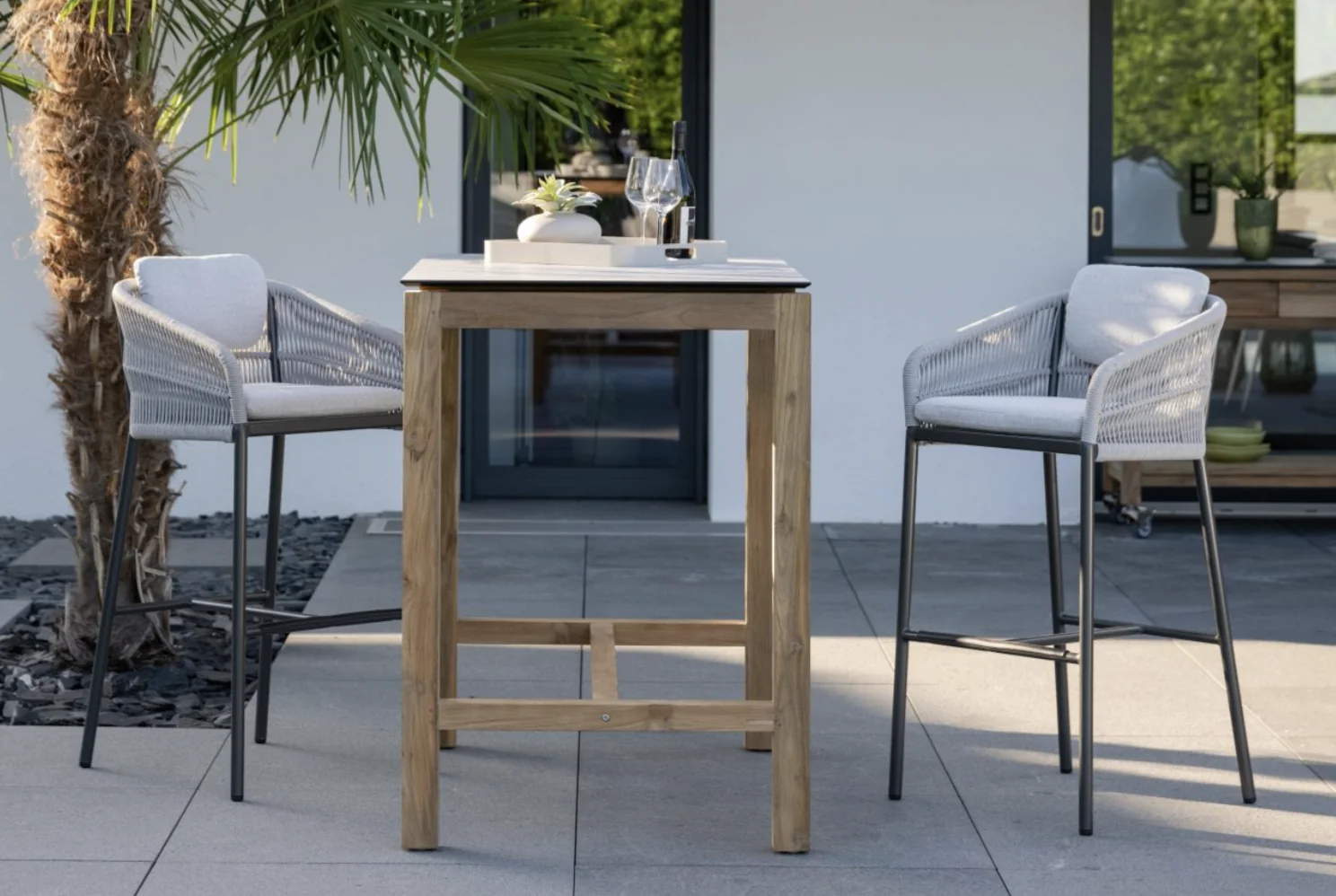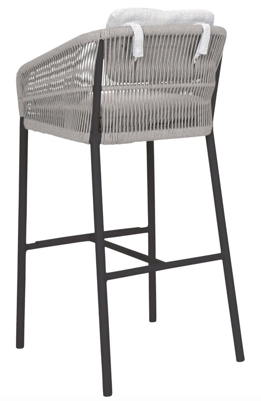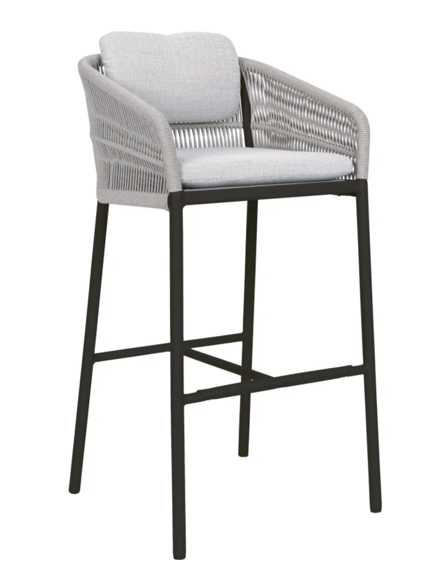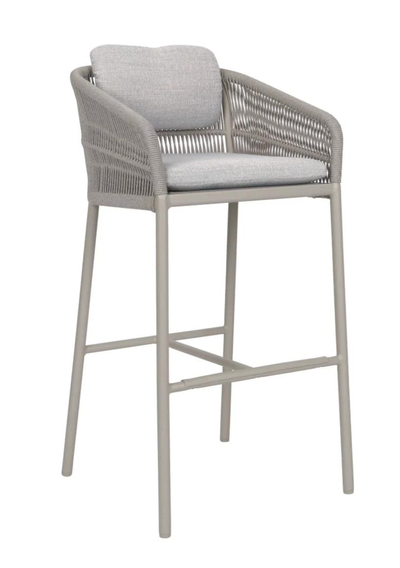 Stern GRETA Barsessel Der Greta Barsessel von Stern kombiniert modernes Design mit einem angenehmen Sitzgefühl. Das leichte Aluminiumgestell sorgt für eine moderne Optik und hohe Stabilität, während die robuste Kordelbespannung (Synthetikfaser) eine elegante Note verleiht und gleichzeitig hohen Sitz- und Liegekomfort bietet. Das weiche Kissenset (100 % Polyacryl) macht das Sitzen besonders bequem. Perfekt für Garten, Terrasse oder Balkon! Polypropylen zeichnet sich durch seine besondere Strapazierfähigkeit aus. Es nimmt kaum Feuchtigkeit auf, ist äußerst lichtecht und hält Temperaturen bis –10 °C mühelos stand. Dank dieser Eigenschaften eignet sich die Faser ideal für den Einsatz im Outdoorbereich. Weitere Materialinformationen entnehmen Sie gerne den beigefügten Dokumenten. Produkteigenschaften Auflage: Abnehmbar & waschbar, 100% Polyacryl Alle Sitz- und Rückenkissen verfügen über einen Reißverschluss Gestell: Aluminium Sitzfläche: Kordel (100% Polypropylen) Sitzhöhe: 82 cm mit Kissen Gewicht: 6 kg Maße: B56 × T55 × H106 cmFarbe: Anthrazit mit Kordel Platin und Kissen SeidengrauDesign: Winkelbauer