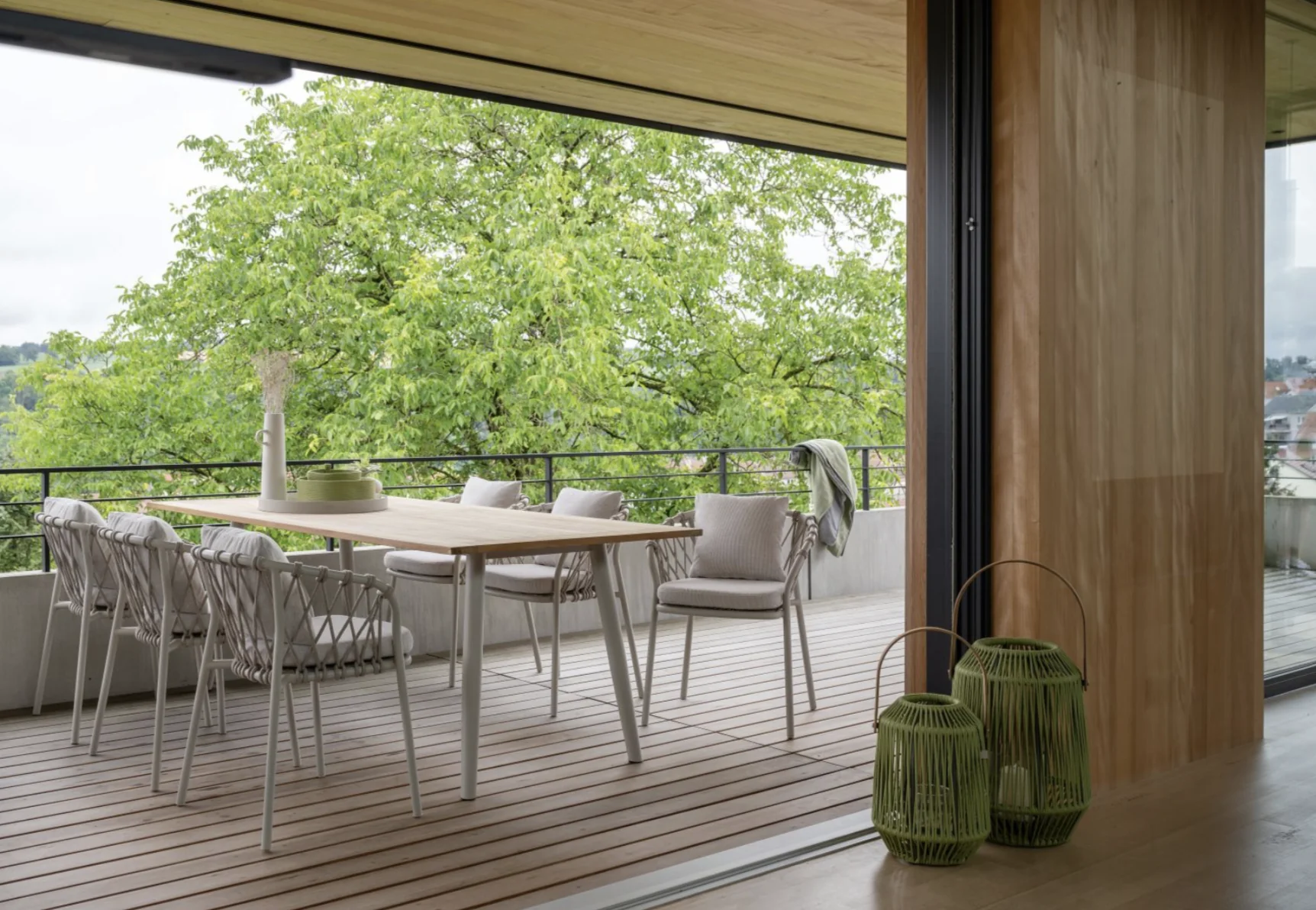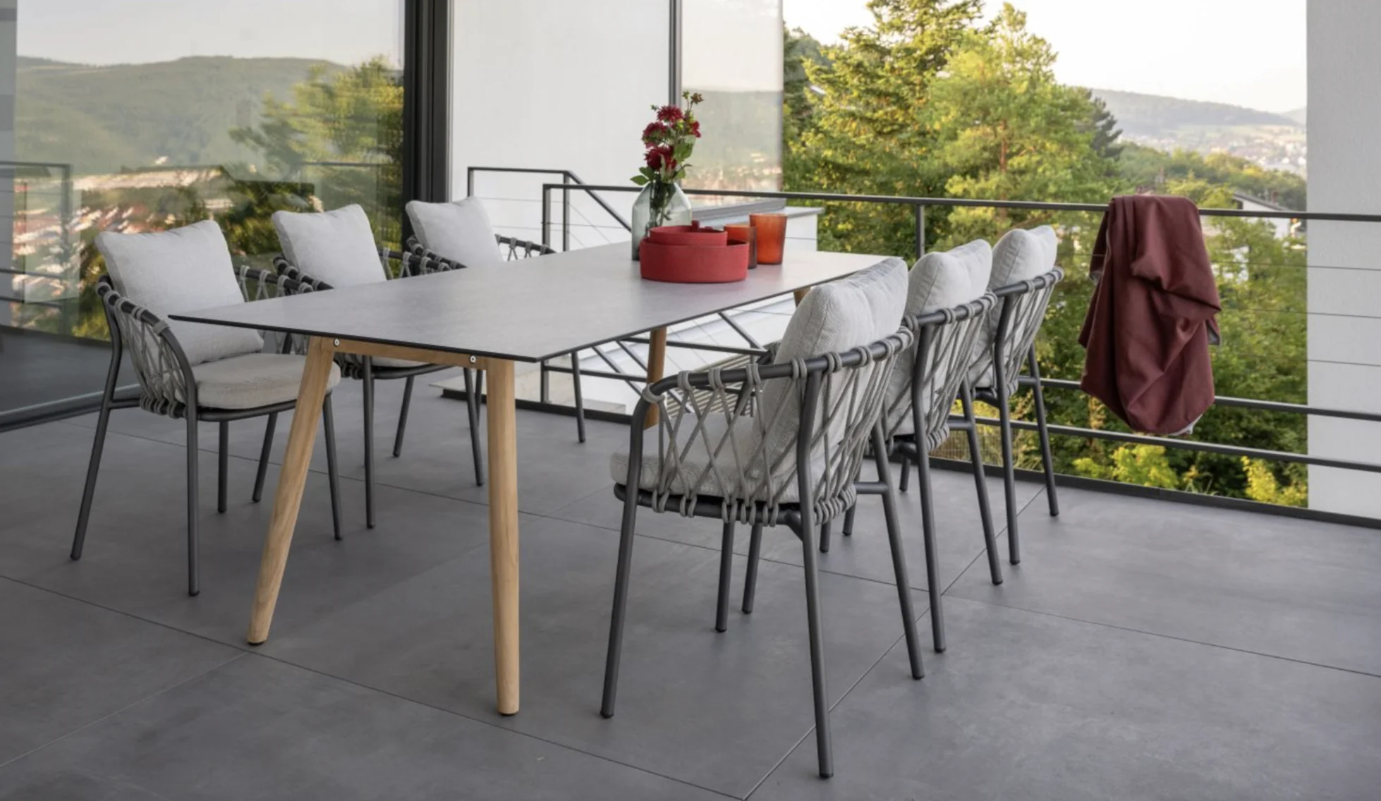 Stern INFERNO Esstisch • verschiedene AusführungenDas Tischsystem INTERNO besticht durch seine nach innen versetzten, schräg gestellten Tischbeine, die der gesamten Sitzgruppe einen attraktiven und dynamischen Look verleihen. Perfekt für Garten, Terrasse oder Balkon! Die Silverstar 2.0 Tischplatte – für höchsten Anspruch an Langlebigkeit und Design! Mit ihrer hohen Widerstandsfähigkeit gegenüber extremen Temperaturen (-20°C bis 160°C) ist diese Tischplatte sowohl kälte- als auch hitzebeständig. Zudem überzeugt sie durch ihre UV-Beständigkeit, Pflegeleichtigkeit und außergewöhnliche Abriebfestigkeit. Ihre kratzunempfindliche Oberfläche bleibt auch nach längerem Gebrauch makellos. Der schwarze Kern der Platte, der aus bis zu 50 Lagen harzimprägnierten Papiers besteht, verleiht ihr nicht nur Stabilität, sondern auch einen modernen Look. Diese Lagen werden unter hohem Druck und großer Hitze mit den Dekorpapieren auf der Ober- und Unterseite der Tischplatte verbunden, was für eine besonders langlebige und attraktive Oberfläche sorgt. Mit einer Plattenstärke von 13 mm ist die Silverstar 2.0 Tischplatte die perfekte Wahl für anspruchsvolle Kunden, die sowohl auf Funktionalität als auch auf ästhetische Details Wert legen. Produkteigenschaften Tischunterkante: 68,5 cmTischplatte Silverstar 2.0 oder TeakholzDesign: Stern