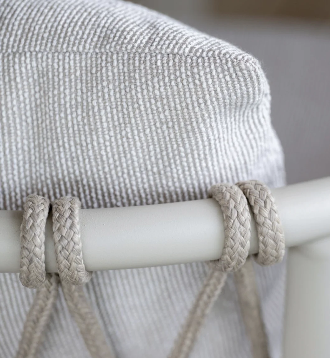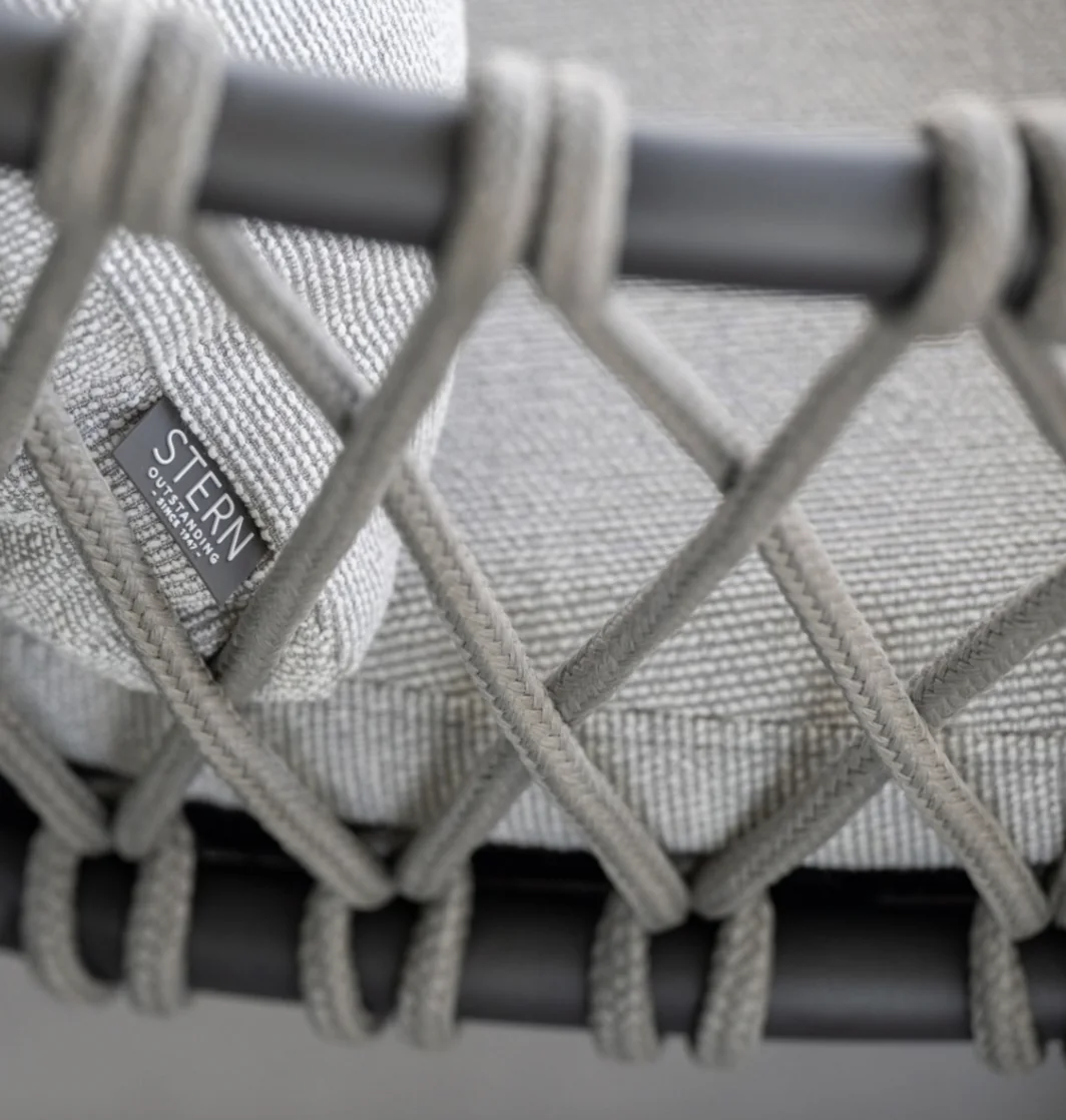 Stern GRETA Freischwingersessel • Kordel Der Greta Freischwingersessel von Stern kombiniert modernes Design mit einem angenehmen SitzgefühlDas leichte Aluminiumgestell sorgt für eine moderne Optik und hohe Stabilität, während die robuste Kordelbespannung (Synthetikfaser) eine elegante Note verleiht und gleichzeitig hohen Sitz- und Liegekomfort bietet. Das weiche Kissenset (100 % Polyacryl) macht das Sitzen besonders bequem. Perfekt für Garten, Terrasse oder Balkon! Polypropylen zeichnet sich durch seine besondere Strapazierfähigkeit aus. Es nimmt kaum Feuchtigkeit auf, ist äußerst lichtecht und hält Temperaturen bis –10 °C mühelos stand. Dank dieser Eigenschaften eignet sich die Faser ideal für den Einsatz im Outdoorbereich. Weitere Materialinformationen entnehmen Sie gerne den beigefügten Dokumenten. Produkteigenschaften Auflage: Abnehmbar & waschbar, 100% Polyacryl Alle Sitz- und Rückenkissen verfügen über einen Reißverschluss Gestell: Aluminium Sitzfläche: Kordel (100% Polypropylen) Maße: B58 × T54 × H90 cm Sitzhöhe: 50 cm mit Kissen Armlehnenhöhe: 65 cm Gewicht: 7,8 kg Design: Winkelbauer