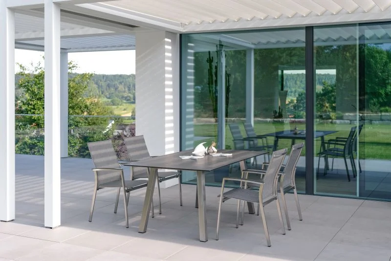 Stern INFERNO Esstisch • verschiedene AusführungenDas Tischsystem INTERNO besticht durch seine nach innen versetzten, schräg gestellten Tischbeine, die der gesamten Sitzgruppe einen attraktiven und dynamischen Look verleihen. Perfekt für Garten, Terrasse oder Balkon! Die Silverstar 2.0 Tischplatte – für höchsten Anspruch an Langlebigkeit und Design! Mit ihrer hohen Widerstandsfähigkeit gegenüber extremen Temperaturen (-20°C bis 160°C) ist diese Tischplatte sowohl kälte- als auch hitzebeständig. Zudem überzeugt sie durch ihre UV-Beständigkeit, Pflegeleichtigkeit und außergewöhnliche Abriebfestigkeit. Ihre kratzunempfindliche Oberfläche bleibt auch nach längerem Gebrauch makellos. Der schwarze Kern der Platte, der aus bis zu 50 Lagen harzimprägnierten Papiers besteht, verleiht ihr nicht nur Stabilität, sondern auch einen modernen Look. Diese Lagen werden unter hohem Druck und großer Hitze mit den Dekorpapieren auf der Ober- und Unterseite der Tischplatte verbunden, was für eine besonders langlebige und attraktive Oberfläche sorgt. Mit einer Plattenstärke von 13 mm ist die Silverstar 2.0 Tischplatte die perfekte Wahl für anspruchsvolle Kunden, die sowohl auf Funktionalität als auch auf ästhetische Details Wert legen. Produkteigenschaften Tischunterkante: 68,5 cmTischplatte Silverstar 2.0 oder TeakholzDesign: Stern