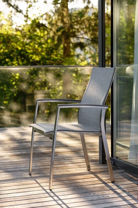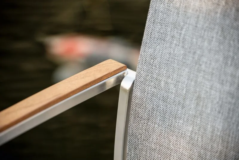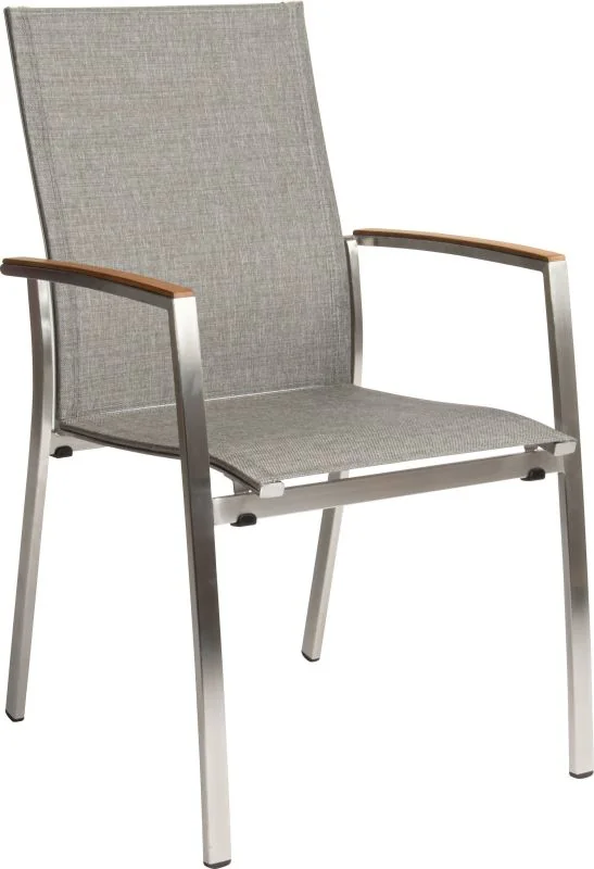 Für eine noch edlere Note ist der Mika Stapelsessel auch mit FSC®-zertifizierten Teakarmlehnen erhältlich, die dem Design eine warme, natürliche Ausstrahlung verleihen. Die Kombination aus Edelstahl, Textilen und Teak macht diesen Sessel zu einem stilvollen und langlebigen Begleiter für Terrasse, Balkon oder Garten.
