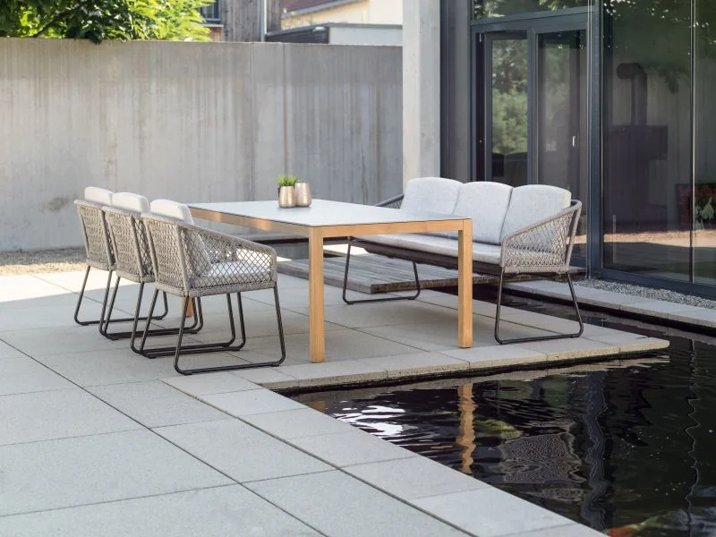 Stern GRETA Dining Set (Ecke) • Kordel Genießen Sie entspannte Stunden unter der Sonne mit dem Stern Greta Dining Ecke. Diese hochwertige Bank Ecke vereint stilvolles Design mit höchstem Komfort und langlebigen Materialien. Das leichte Aluminiumgestell sorgt für eine moderne Optik und hohe Stabilität, während die robuste Kordelbespannung (Synthetikfaser) eine elegante Note verleiht und gleichzeitig hohen Sitz- und Liegekomfort bietet. Das weiche Kissenset (100 % Polyacryl) macht das Sitzen besonders bequem. Perfekt für Garten, Terrasse oder Balkon! Polypropylen zeichnet sich durch seine besondere Strapazierfähigkeit aus. Es nimmt kaum Feuchtigkeit auf, ist äußerst lichtecht und hält Temperaturen bis –10 °C mühelos stand. Dank dieser Eigenschaften eignet sich die Faser ideal für den Einsatz im Outdoorbereich. Materialinformationen entnehmen Sie gerne den beigefügten Dokumenten. Produkteigenschaften Auflage: Abnehmbar & waschbar, 100% Polyacryl Alle Sitz- und Rückenkissen verfügen über einen Reißverschluss Gestell: Aluminium Optional: Ecke links oder rechts (sitzend)Sitzfläche: Kordel (100% Polypropylen) Maße: B252 × T54 × H86 cmSitzhöhe: 48 cm mit Kissen Armlehnenhöhe: 62,5 cm Gewicht: 46 kg Design: WinkelbauerDas anthrazitfarbene Aluminiumgestell sorgt für eine moderne Optik und hohe Stabilität. Die Sitzfläche aus robuster Kordelbespannung in Platin (Ø 4 mm, 100 % Polypropylen) verleiht der Bank eine elegante Note und bietet gleichzeitig hohen Sitz- und Liegekomfort. Produkteigenschaften Gestell: Aluminium, Farbe AnthrazitBestehend aus zwei Elementen die eine Eckbank erzeugen Sitzfläche: Kordel (100% Polypropylen), Farbe Platin Auflage: Seidengrau, 100% Polyacryl, abnehmbar & waschbar Optional: Ecke links oder rechts (sitzend) Maße: B252 × T54 × H86 cm Gewicht: 46 kg