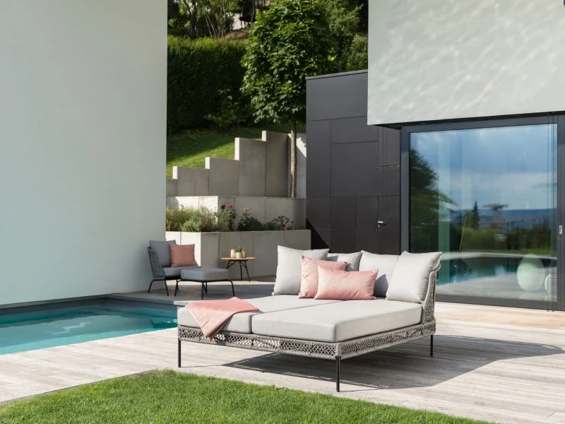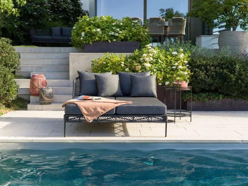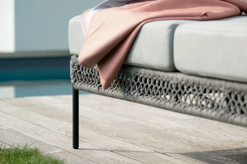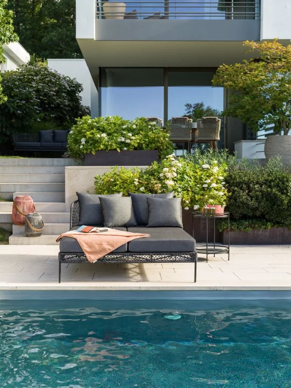 Die ODEA Doppelliege vereint modernes Design mit höchster Handwerkskunst von Stern und sorgt für stilvolle Akzente im Outdoor-Bereich. Das Gestell aus Aluminium in Schwarz matt verleiht ihm eine elegante Verspieltheit und garantiert gleichzeitig Stabilität und Wetterbeständigkeit.