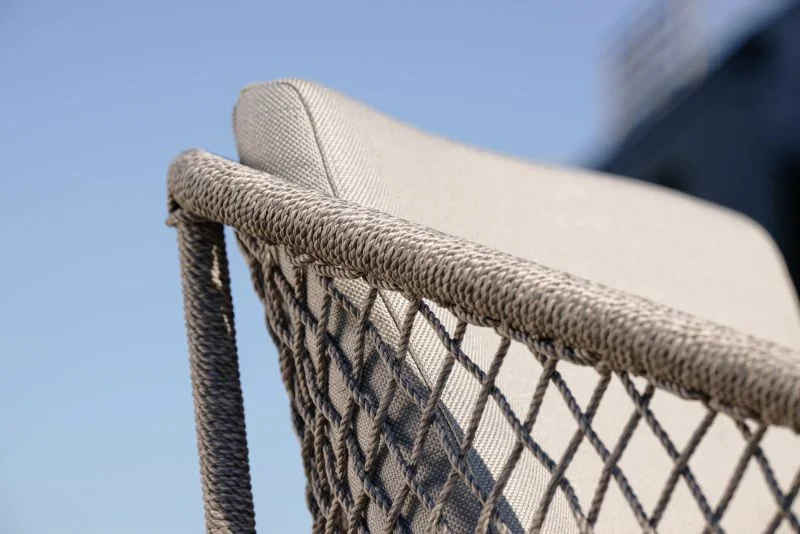 Stern GRETA Sessel Stern • Kordel Das leichte Aluminiumgestell sorgt für eine moderne Optik und hohe Stabilität, während die robuste Kordelbespannung (Synthetikfaser) eine elegante Note verleiht und gleichzeitig hohen Sitz- und Liegekomfort bietet. Das weiche Kissenset (100 % Polyacryl) macht das Sitzen besonders bequem. Perfekt für Garten, Terrasse oder Balkon! Polypropylen zeichnet sich durch seine besondere Strapazierfähigkeit aus. Es nimmt kaum Feuchtigkeit auf, ist äußerst lichtecht und hält Temperaturen bis –10 °C mühelos stand. Dank dieser Eigenschaften eignet sich die Faser ideal für den Einsatz im Outdoorbereich. Weitere Materialinformationen entnehmen Sie gerne den beigefügten Dokumenten. Produkteigenschaften Auflage: Abnehmbar & waschbar, 100% Polyacryl Alle Sitz- und Rückenkissen verfügen über einen Reißverschluss Gestell: Aluminium Sitzfläche: Kordel (100% Polypropylen) Maße: B62 × T62 × H87 cmSitzhöhe: 50 cm mit Kissen Armlehnenhöhe: 64,5 cm Gewicht: 6,9 kg Design: Winkelbauer
