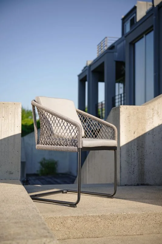 Stern GRETA Freischwingersessel • Kordel Der Greta Freischwingersessel von Stern kombiniert modernes Design mit einem angenehmen SitzgefühlDas leichte Aluminiumgestell sorgt für eine moderne Optik und hohe Stabilität, während die robuste Kordelbespannung (Synthetikfaser) eine elegante Note verleiht und gleichzeitig hohen Sitz- und Liegekomfort bietet. Das weiche Kissenset (100 % Polyacryl) macht das Sitzen besonders bequem. Perfekt für Garten, Terrasse oder Balkon! Polypropylen zeichnet sich durch seine besondere Strapazierfähigkeit aus. Es nimmt kaum Feuchtigkeit auf, ist äußerst lichtecht und hält Temperaturen bis –10 °C mühelos stand. Dank dieser Eigenschaften eignet sich die Faser ideal für den Einsatz im Outdoorbereich. Weitere Materialinformationen entnehmen Sie gerne den beigefügten Dokumenten. Produkteigenschaften Auflage: Abnehmbar & waschbar, 100% Polyacryl Alle Sitz- und Rückenkissen verfügen über einen Reißverschluss Gestell: Aluminium Sitzfläche: Kordel (100% Polypropylen) Maße: B58 × T54 × H90 cm Sitzhöhe: 50 cm mit Kissen Armlehnenhöhe: 65 cm Gewicht: 7,8 kg Design: Winkelbauer