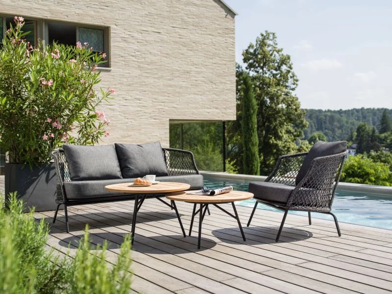 Stern GRETA Lounge-Sofa • Kordel Das Greta Lounge-Sofa von Stern besticht durch sein stilvolles Design und höchsten Sitzkomfort. Das leichte Aluminiumgestell sorgt für eine moderne Optik und hohe Stabilität, während die robuste Kordelbespannung (Synthetikfaser) eine elegante Note verleiht und gleichzeitig hohen Sitz- und Liegekomfort bietet. Das weiche Kissenset (100 % Polyacryl) macht das Sitzen besonders bequem. Perfekt für Garten, Terrasse oder Balkon! Polypropylen zeichnet sich durch seine besondere Strapazierfähigkeit aus. Es nimmt kaum Feuchtigkeit auf, ist äußerst lichtecht und hält Temperaturen bis –10 °C mühelos stand. Dank dieser Eigenschaften eignet sich die Faser ideal für den Einsatz im Outdoorbereich. Weitere Materialinformationen entnehmen Sie gerne den beigefügten Dokumenten. ProdukteigenschaftenAuflage: Abnehmbar & waschbar, 100% Polyacryl Alle Sitz- und Rückenkissen verfügen über einen ReißverschlussGestell: AluminiumSitzfläche: Kordel (100% Polypropylen)Maße: B166 × T74 × H102 cmSitzhöhe: 47 cm mit KissenArmlehnenhöhe: 62,5 cmGewicht: 21,1 kgFarbe: Anthrazit mit Kordel Platin und Kissen SeidengrauDesign: Winkelbauer