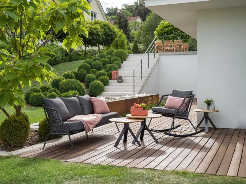Stern GRETA Dining Set (Ecke) • Kordel Genießen Sie entspannte Stunden unter der Sonne mit dem Stern Greta Dining Ecke. Diese hochwertige Bank Ecke vereint stilvolles Design mit höchstem Komfort und langlebigen Materialien. Das leichte Aluminiumgestell sorgt für eine moderne Optik und hohe Stabilität, während die robuste Kordelbespannung (Synthetikfaser) eine elegante Note verleiht und gleichzeitig hohen Sitz- und Liegekomfort bietet. Das weiche Kissenset (100 % Polyacryl) macht das Sitzen besonders bequem. Perfekt für Garten, Terrasse oder Balkon! Polypropylen zeichnet sich durch seine besondere Strapazierfähigkeit aus. Es nimmt kaum Feuchtigkeit auf, ist äußerst lichtecht und hält Temperaturen bis –10 °C mühelos stand. Dank dieser Eigenschaften eignet sich die Faser ideal für den Einsatz im Outdoorbereich. Materialinformationen entnehmen Sie gerne den beigefügten Dokumenten. Produkteigenschaften Auflage: Abnehmbar & waschbar, 100% Polyacryl Alle Sitz- und Rückenkissen verfügen über einen Reißverschluss Gestell: Aluminium Optional: Ecke links oder rechts (sitzend)Sitzfläche: Kordel (100% Polypropylen) Maße: B252 × T54 × H86 cmSitzhöhe: 48 cm mit Kissen Armlehnenhöhe: 62,5 cm Gewicht: 46 kg Design: WinkelbauerDas anthrazitfarbene Aluminiumgestell sorgt für eine moderne Optik und hohe Stabilität. Die Sitzfläche aus robuster Kordelbespannung in Platin (Ø 4 mm, 100 % Polypropylen) verleiht der Bank eine elegante Note und bietet gleichzeitig hohen Sitz- und Liegekomfort. Produkteigenschaften Gestell: Aluminium, Farbe AnthrazitBestehend aus zwei Elementen die eine Eckbank erzeugen Sitzfläche: Kordel (100% Polypropylen), Farbe Platin Auflage: Seidengrau, 100% Polyacryl, abnehmbar & waschbar Optional: Ecke links oder rechts (sitzend) Maße: B252 × T54 × H86 cm Gewicht: 46 kg