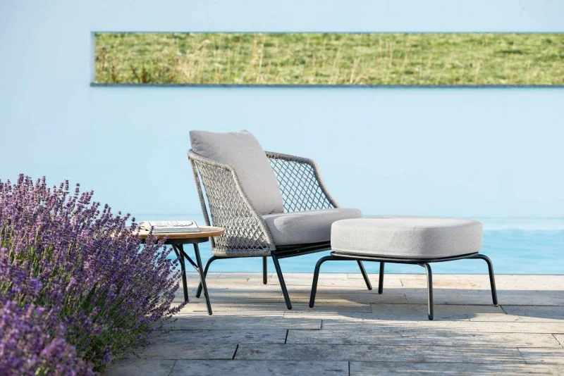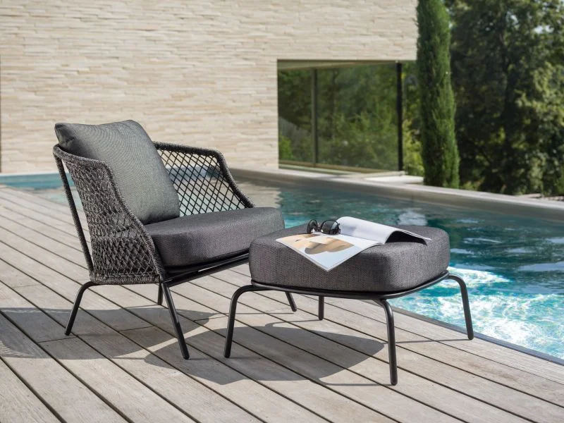 Der ODEA Lounge Hocker vereint modernes Design mit höchster Handwerkskunst und sorgt für stilvolle Akzente im Outdoor-Bereich. Sein stabiles Gestell aus Aluminium in Schwarz matt verleiht ihm eine elegante Leichtigkeit und garantiert gleichzeitig höchste Stabilität und Wetterbeständigkeit.