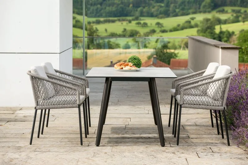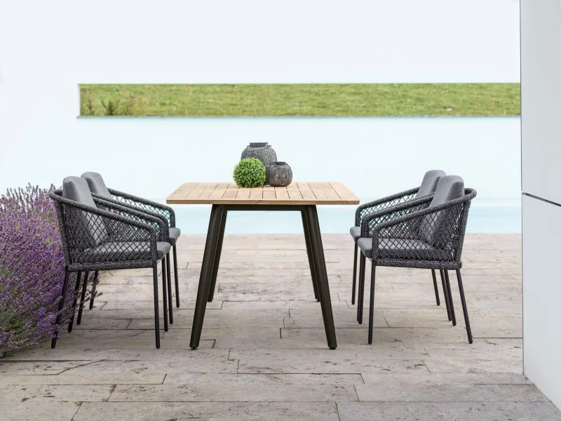 Stern INFERNO Esstisch • verschiedene AusführungenDas Tischsystem INTERNO besticht durch seine nach innen versetzten, schräg gestellten Tischbeine, die der gesamten Sitzgruppe einen attraktiven und dynamischen Look verleihen. Perfekt für Garten, Terrasse oder Balkon! Die Silverstar 2.0 Tischplatte – für höchsten Anspruch an Langlebigkeit und Design! Mit ihrer hohen Widerstandsfähigkeit gegenüber extremen Temperaturen (-20°C bis 160°C) ist diese Tischplatte sowohl kälte- als auch hitzebeständig. Zudem überzeugt sie durch ihre UV-Beständigkeit, Pflegeleichtigkeit und außergewöhnliche Abriebfestigkeit. Ihre kratzunempfindliche Oberfläche bleibt auch nach längerem Gebrauch makellos. Der schwarze Kern der Platte, der aus bis zu 50 Lagen harzimprägnierten Papiers besteht, verleiht ihr nicht nur Stabilität, sondern auch einen modernen Look. Diese Lagen werden unter hohem Druck und großer Hitze mit den Dekorpapieren auf der Ober- und Unterseite der Tischplatte verbunden, was für eine besonders langlebige und attraktive Oberfläche sorgt. Mit einer Plattenstärke von 13 mm ist die Silverstar 2.0 Tischplatte die perfekte Wahl für anspruchsvolle Kunden, die sowohl auf Funktionalität als auch auf ästhetische Details Wert legen. Produkteigenschaften Tischunterkante: 68,5 cmTischplatte Silverstar 2.0 oder TeakholzDesign: Stern