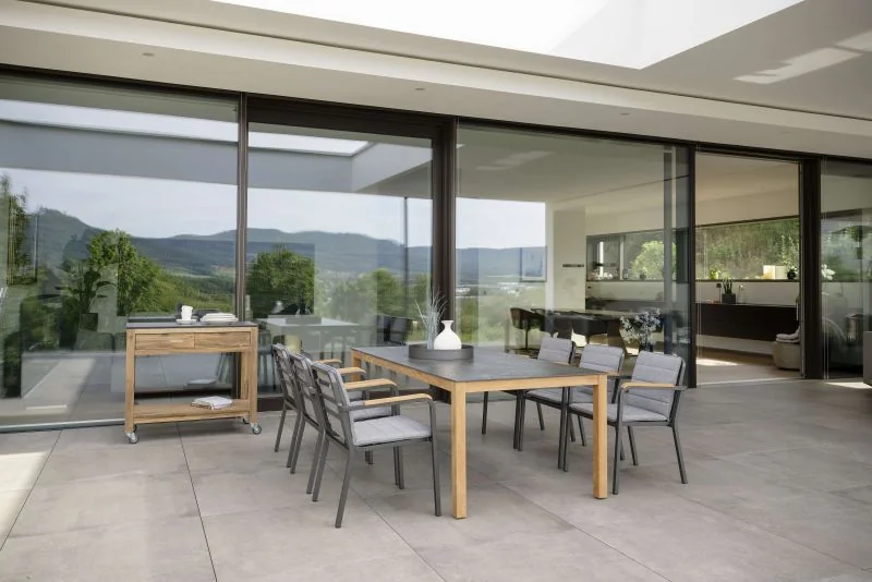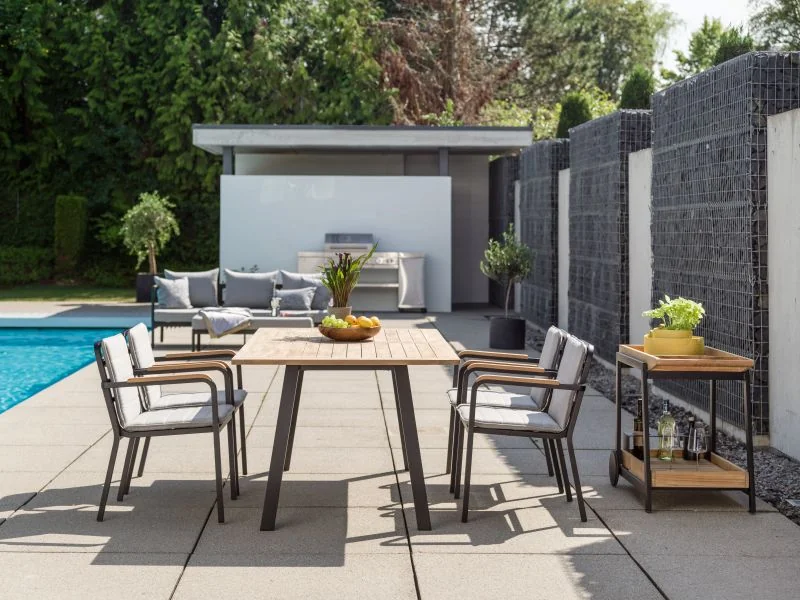 Stern INFERNO Esstisch • verschiedene AusführungenDas Tischsystem INTERNO besticht durch seine nach innen versetzten, schräg gestellten Tischbeine, die der gesamten Sitzgruppe einen attraktiven und dynamischen Look verleihen. Perfekt für Garten, Terrasse oder Balkon! Die Silverstar 2.0 Tischplatte – für höchsten Anspruch an Langlebigkeit und Design! Mit ihrer hohen Widerstandsfähigkeit gegenüber extremen Temperaturen (-20°C bis 160°C) ist diese Tischplatte sowohl kälte- als auch hitzebeständig. Zudem überzeugt sie durch ihre UV-Beständigkeit, Pflegeleichtigkeit und außergewöhnliche Abriebfestigkeit. Ihre kratzunempfindliche Oberfläche bleibt auch nach längerem Gebrauch makellos. Der schwarze Kern der Platte, der aus bis zu 50 Lagen harzimprägnierten Papiers besteht, verleiht ihr nicht nur Stabilität, sondern auch einen modernen Look. Diese Lagen werden unter hohem Druck und großer Hitze mit den Dekorpapieren auf der Ober- und Unterseite der Tischplatte verbunden, was für eine besonders langlebige und attraktive Oberfläche sorgt. Mit einer Plattenstärke von 13 mm ist die Silverstar 2.0 Tischplatte die perfekte Wahl für anspruchsvolle Kunden, die sowohl auf Funktionalität als auch auf ästhetische Details Wert legen. Produkteigenschaften Tischunterkante: 68,5 cmTischplatte Silverstar 2.0 oder TeakholzDesign: Stern