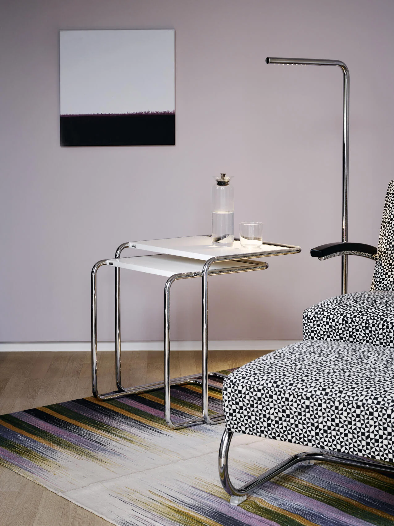Die Beistelltische THONET B 97 sind elegante und vielseitige Möbelstücke, die sich durch ihre flexible Nutzung und ihr zeitloses Design auszeichnen. Inspiriert von Marcel Breuers Satztischen B 9 bietet das B 97 Set einen besonderen praktischen Vorteil: Durch die einseitig offene Konstruktion lassen sich die Tische bequem über die Kante von Sofas, Sesseln oder Betten schieben und dienen so als praktische Ablagefläche. Alternativ können die Tische auch platzsparend ineinander geschoben werden.