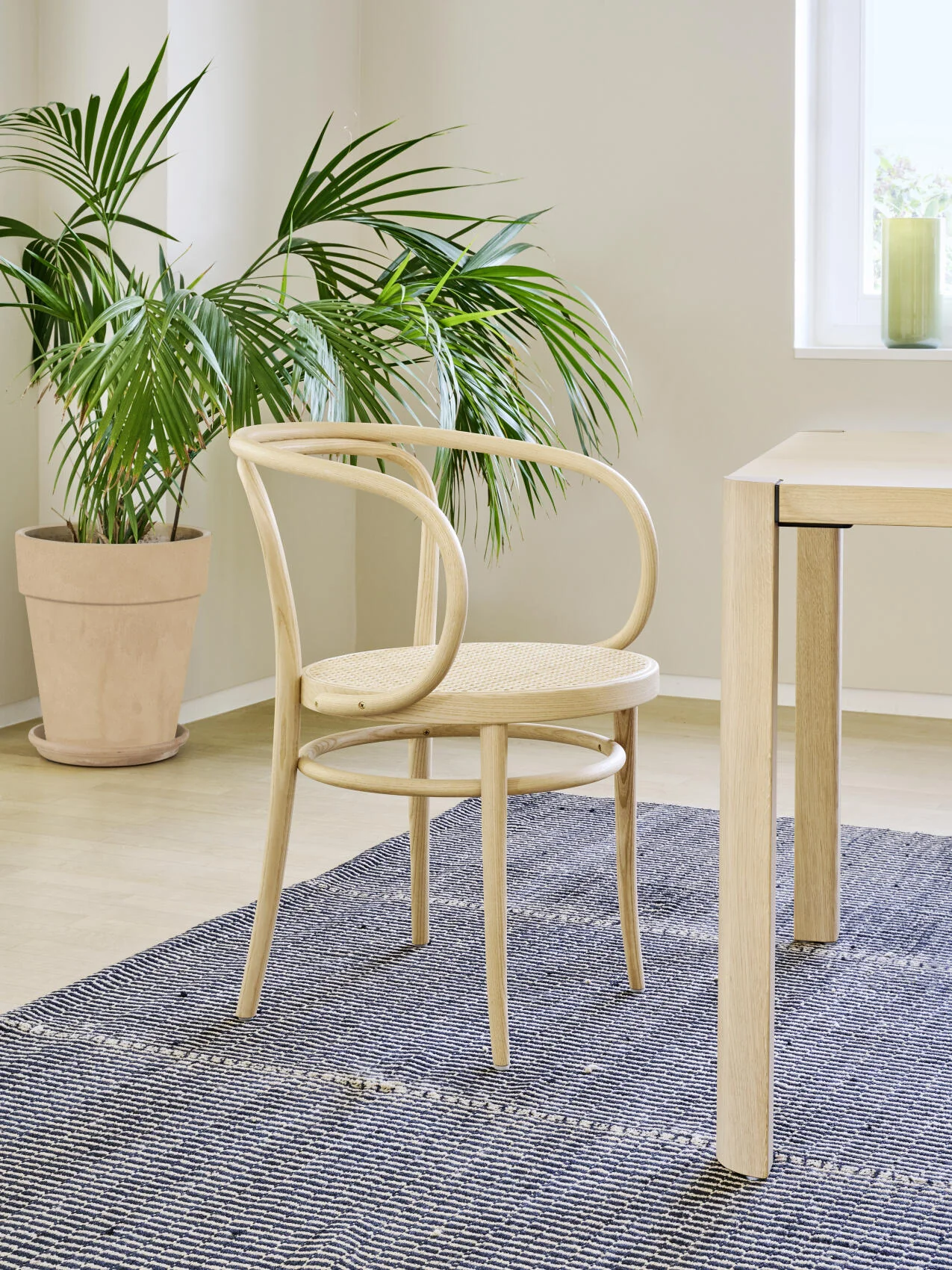 THONET Massivholzstuhl Sitz Rohrgeflecht | 118 Der 118 ist ein klassischer Holzstuhl mit minimalistischer Eleganz, der subtile Raffinesse an jeden Esstisch oder in jedes Restaurant bringt. Konzipiert von Sebastian Herkner, vereint er traditionelles Erbe mit zeitgemäßem Design und zeichnet sich durch feine Details aus. Die gerundeten Außenseiten der Stuhlbeine harmonieren perfekt mit der hufeisenförmigen Grundfläche des Sitzes. Der Stuhl erinnert an den Ursprung des Thonet-Bugholzstuhls, den 214, und wird durch die Barhocker 118 H und den komfortablen Armlehnstuhl 118 FV ergänzt. Letzterer, speziell für das Fine Dining entworfen, bietet eine großzügigere Sitzfläche und eine leicht nach hinten geneigte Rückenlehne für maximalen Komfort. MassivholzSitz aus Wiener-Geflecht Naturoptional mit Gleiterninkl. Kunststoffgleiter Maße (B x T x H):42 x 50 x 80 cmSitzhöhe: 46 cmGewicht: 4 kg