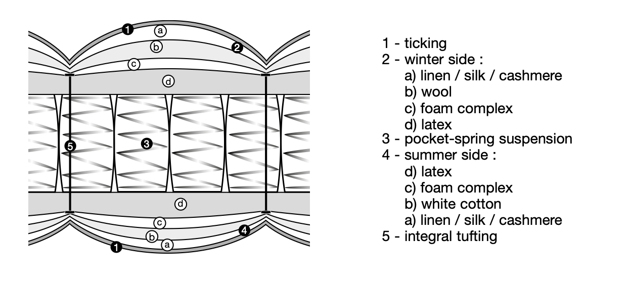 TRECA PARIS Impérial Corpus Prestige • ObermatratzeTreca Paris Schlaftabelle Mit Tréca betreten Sie ein Universum, in dem all Ihre Träume wahr werdenTréca pflegt sein Know-how über Generationen hinweg, um Ihnen den besten Schlaf zu bieten. Tréca verspricht Ihnen ein Haute-Couture-Erlebnis und begleitet Sie bei der Verwirklichung Ihrer Innenarchitektur- und Dekorationsprojekte: Schlafzimmer, komplette Villen, Gästehäuser, Hotelprojekte, Elternsuiten, Yachten... Tréca ist mehr als nur eine Matratze oder ein Bett, es ist ein Lifestyle, eine art de la chambre. Jedes Detail zählt, um die Perfektion zu erreichen. Exklusiv handgefertigt in Frankreich, sorgfältig genäht, gepolstert und gepackt, erfordert die Anfertigung einer Matratze die Beherrschung vieler Fertigkeiten, vor allem jedoch braucht es Zeit. Zeit ist kostbar, um jede Matratze zu einem Meisterwerk französischer Handwerkskunst zu machen. Perfekt in jeder Hinsicht, in jedem Detail. Bei Tréca wird alles sorgfältig durchdacht und entworfen. Tréca legt großen Wert auf die Auswahl edler, natürlicher und langlebiger Materialien und suchen sie dort, wo sie am feinsten sind. Natürliche Fasern, die über die Zeit hinweg beständig sind, resilient, glatt, seidig… das sind die Eigenschaften, die die Matratzen von Tréca außergewöhnlich machen.Die Impérial Corpus Prestige vereint luxuriöse Materialien mit außergewöhnlichem Liegekomfort. Die Matratze nutzt ein Federungssystem aus abwechselnden Reihen großer und kleiner Taschenfedern: Die größeren Federn bieten eine sanfte Aufnahme, während die kleineren für eine stabile, ergonomische Unterstützung sorgen. Zudem ist die Matratze in drei Härtegraden verfügbar.Merkmale "Impérial Corpus Prestige": Härtegrad: elastisch, mittel, festHöhe 29 cmFederung: Air Spring® TaschenfedernHochwertige Verarbeitung für langlebige Qualität Angenehme Polsterung aus einer sorgfältig abgestimmten Mischung aus Viskose und Baumwolle Elegantes Design aus dem Hause Tréca Acht seitliche Griffe mit eingesticktem Tréca-Schriftzug für einfaches Wenden und ein edles Finish Vier integrierte Lüfter an den Matratzenseiten für optimale Belüftung und ein gesundes, frisches SchlafklimaPassende Matratzenauflagen: Opéra, Pont de l'Alma und RivoliGerne bieten wir Ihnen auf Anfrage eine Auswahl weiterer Stoffe, Matratzengrößen und weitere Sonderoptionen wie Reißverschlüsse an. Kontaktieren Sie uns telefonisch oder per E-Mail – unser Team berät Sie individuell und kompetent.Air Spring®-Tonnentaschenfedern: Die flexibel gelagerten Federn sorgen für hervorragende Bewegungsunabhängigkeit und passen sich dank ihres progressiven Komforts sanft jeder Schlafbewegung an. Handgefertigte Innenheftung: Die traditionelle Innenheftung aus dem Hause Tréca wird vollständig von Hand ausgeführt. Die Abheftung ist eine Form der Veredelung der Matratze mit einer gepolsterten Liegefläche und einer hervorragenden Festigkeit aller Materialien.Kantenverstärkung: Eine stabile Randabstützung schützt die Materialstruktur im Inneren und sorgt für eine hohe Formbeständigkeit sowie eine lange Lebensdauer der Matratze. Hochwertige Klimaschichten: Die Matratze Imperial Corpus Prestige verfügt über zwei Seiten mit unterschiedlichen Klimaeigenschaften. Winterseite: Ausgestattet mit 3 cm Softcare® Soft-Schaum und 400 g/m² Climawatt®. Diese nicht sensibilisierende Faser überzeugt durch hervorragende thermoregulierende Eigenschaften, leitet Feuchtigkeit an die Oberfläche und ermöglicht so eine schnelle Verdunstung. Sommerseite: Besteht aus 1,5 cm Softcare® Soft-Schaum und 900 g/m² Ingeo®-Faser. Ingeo® wird aus nachwachsenden Rohstoffen gewonnen und sorgt für ein angenehm weiches, flauschiges Liegegefühl sowie gute Isolierung und Luftzirkulation.Option Weiche Schulterzone: Entlastung des Schulterbereichs durch eine auf dieses Niveau abgestimmte Federung, eine exklusive Polsterung und Auflage. Für optimalen Komfort sind die Federn in diesem Bereich weicher. Option Leinenpolsterung: Französisches Leinen aus Nordfrankreich und der Normandie hergestellt. Nachhaltig produziert und ausgezeichnet mit dem Label Entreprise du Patrimoine Vivant.Drell: Der sichtbare Teil der Matratze, der Stoff, der die Matratze umhüllt und schützt.