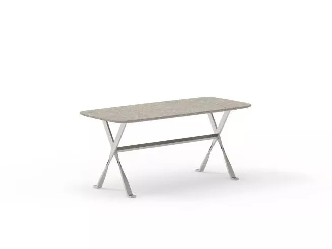 Stern INFERNO Esstisch • verschiedene AusführungenDas Tischsystem INTERNO besticht durch seine nach innen versetzten, schräg gestellten Tischbeine, die der gesamten Sitzgruppe einen attraktiven und dynamischen Look verleihen. Perfekt für Garten, Terrasse oder Balkon! Die Silverstar 2.0 Tischplatte – für höchsten Anspruch an Langlebigkeit und Design! Mit ihrer hohen Widerstandsfähigkeit gegenüber extremen Temperaturen (-20°C bis 160°C) ist diese Tischplatte sowohl kälte- als auch hitzebeständig. Zudem überzeugt sie durch ihre UV-Beständigkeit, Pflegeleichtigkeit und außergewöhnliche Abriebfestigkeit. Ihre kratzunempfindliche Oberfläche bleibt auch nach längerem Gebrauch makellos. Der schwarze Kern der Platte, der aus bis zu 50 Lagen harzimprägnierten Papiers besteht, verleiht ihr nicht nur Stabilität, sondern auch einen modernen Look. Diese Lagen werden unter hohem Druck und großer Hitze mit den Dekorpapieren auf der Ober- und Unterseite der Tischplatte verbunden, was für eine besonders langlebige und attraktive Oberfläche sorgt. Mit einer Plattenstärke von 13 mm ist die Silverstar 2.0 Tischplatte die perfekte Wahl für anspruchsvolle Kunden, die sowohl auf Funktionalität als auch auf ästhetische Details Wert legen. Produkteigenschaften Tischunterkante: 68,5 cmTischplatte Silverstar 2.0 oder TeakholzDesign: Stern