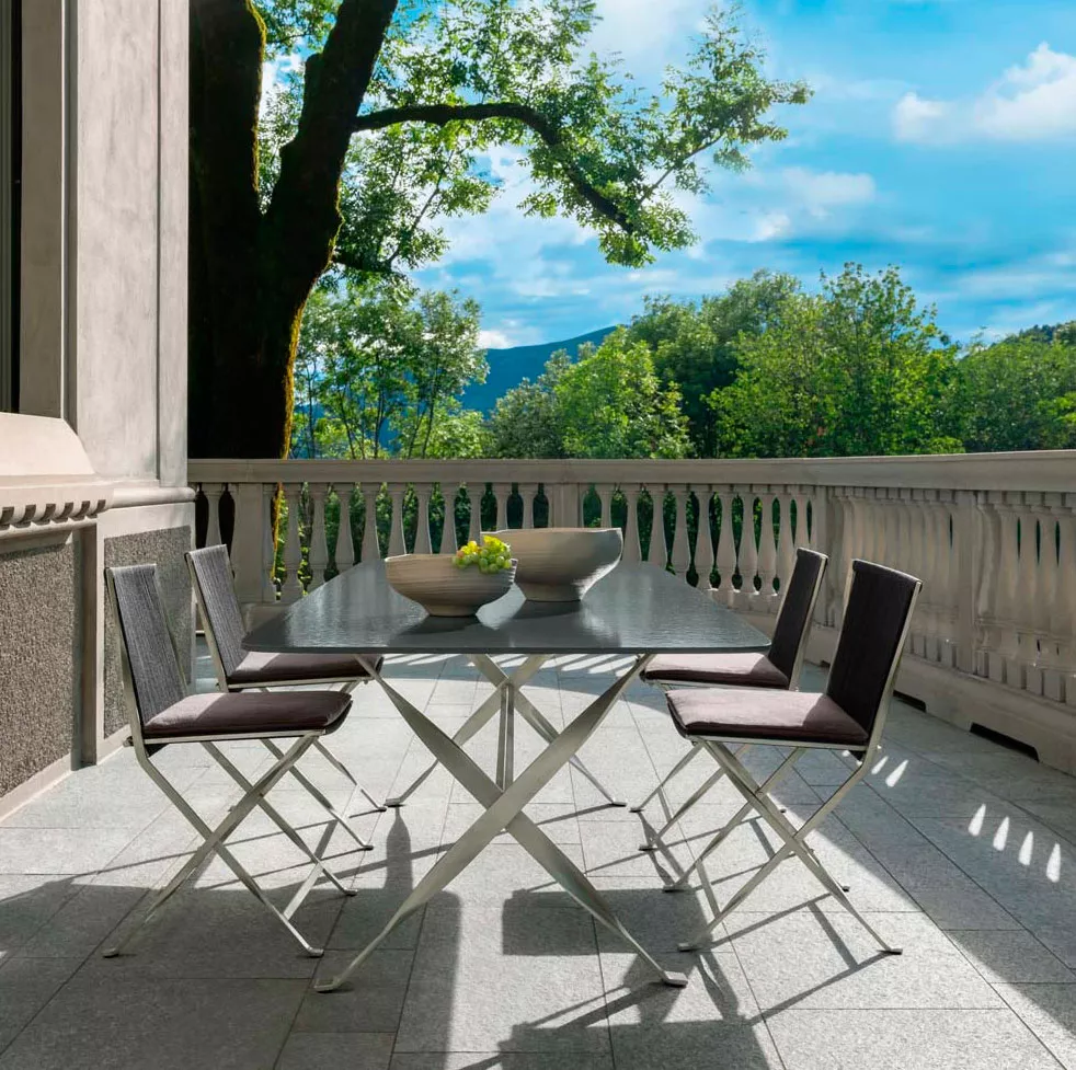 Talenti SWIPE Esstisch Dynamik und Bewegung sind die Konzepte, die das Design des Swipe Esstisches inspirieren. Mit einem Durchmesser von 150 cm verleiht dieses Möbelstück den Momenten der Geselligkeit im Garten oder auf der Terrasse eine besondere Leichtigkeit. Die Aluminiumrohrstruktur, umhüllt von einem geometrisch angeordneten gepolsterten Seilgeflecht, verleiht dem Tisch eine spielerische Eleganz und optische Leichtigkeit. Die dünne Feinsteinzeugplatte scheint dabei förmlich zu schweben und verstärkt den modernen Look. Produkteigenschaften Gestell: Aluminium, pulverbeschichtet Gepolstertes SeilgeflechtFeinsteinzeugplatte Verfügbare Maße: B150 × T150 × H75 cmB220 x T110 x H75 cmB300 x T110 x H75 cm Gewicht: 49 kg Achtung: Dekokissen können separat erworben werden - nicht im Lieferumfang enthalten Wir sind exklusiver Händler von Talenti - Outdoor Living. Falls Sie einen Artikel nicht bei uns im Online-Shop finden, zögern Sie nicht uns zu kontaktieren. Wir können Ihnen die gesamte Talenti-Kollektion bestellen.