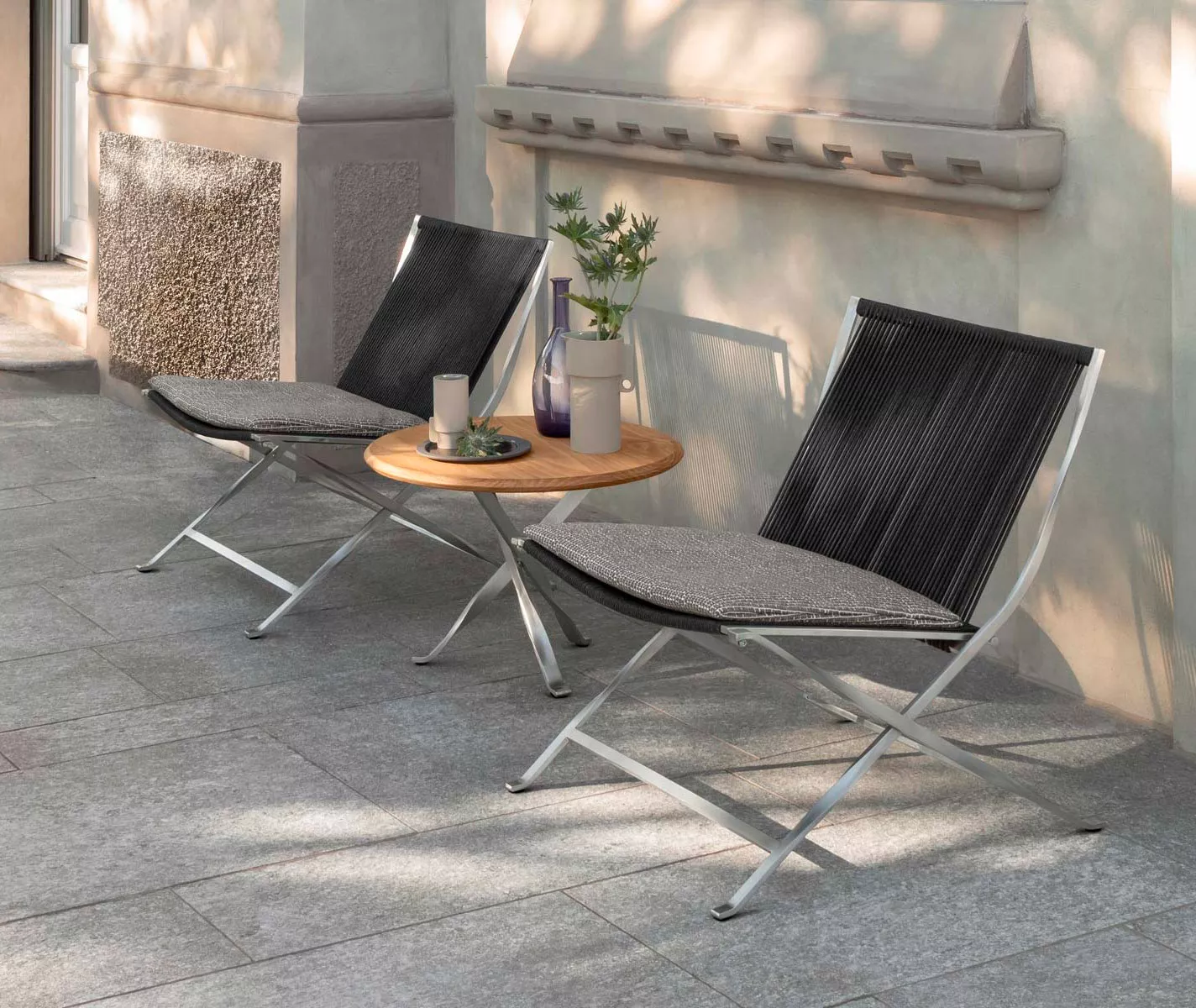 Stern ODEA Lounge Sessel Der ODEA Lounge Sessel vereint modernes Design mit höchster Handwerkskunst und sorgt für stilvolle Akzente im Outdoor-Bereich. Sein stabiles Gestell aus Aluminium in Schwarz matt verleiht ihm eine elegante Leichtigkeit und garantiert gleichzeitig höchste Stabilität und Wetterbeständigkeit. Produkteigenschaften Gestell: Aluminium, Farbe Schwarz Kordel: Pepper (Seidenschwarz) oder Salt (Cream) Optional: Schutzhülle Maße: B79 × T77 × H80 cmSitzhöhe: 44 cm Gewicht: 9,4 kg