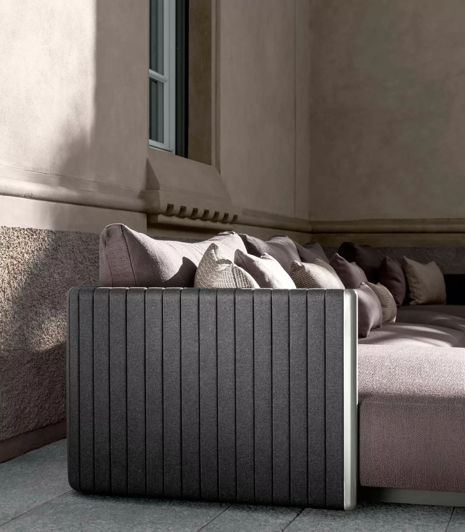 gepolsterte Sitz- und Rückenkissen kontrapunktiert.