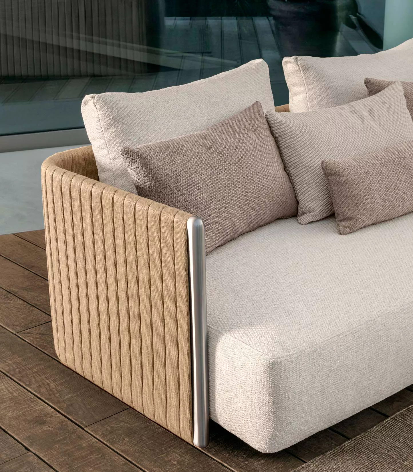 Alle Elemente zeichnen sich durch eine Konstruktion aus Edelstahl aus. Die Sofas verfügen über Rückenlehnen, die mit einem gepolsterten Gurtgewebe bespannt sind, erhältlich in Beige (B9) und Dunkelgrau (B10). Der Stoff ist in den Varianten Natur-Elfenbein (C71), Dunkelgrün (C72) oder Einfarbig-Lehm (C78) erhältlich. Die Kissen bestehen aus Stoff und sind abnehmbar, leicht zu waschen und beständig gegenüber atmosphärischen Einflüssen. Die Polsterung besteht aus schnelltrocknendem Schaumstoff. Der Loungesessel verfügt über eine 360°-Drehbasis. Lounge-Armlehnstuhl und Gartenstuhl haben eine faltbare Konstruktion, Sitz und Rückenlehne sind mit einem Synthetik-Seilgewebe bespannt, erhältlich in Dunkelgrau (R8) und Taubengrau (R29). Als eine Bereicherung der Kollektion stehen Gartentische und Couchtische mit 12mm Lavastein-Tops in den Farben Beige (S27), Dunkelgrün (S28) und Dunkelgrau (S29) sowie mit Naturteakholz-Tops (L2) zur Verfügung.