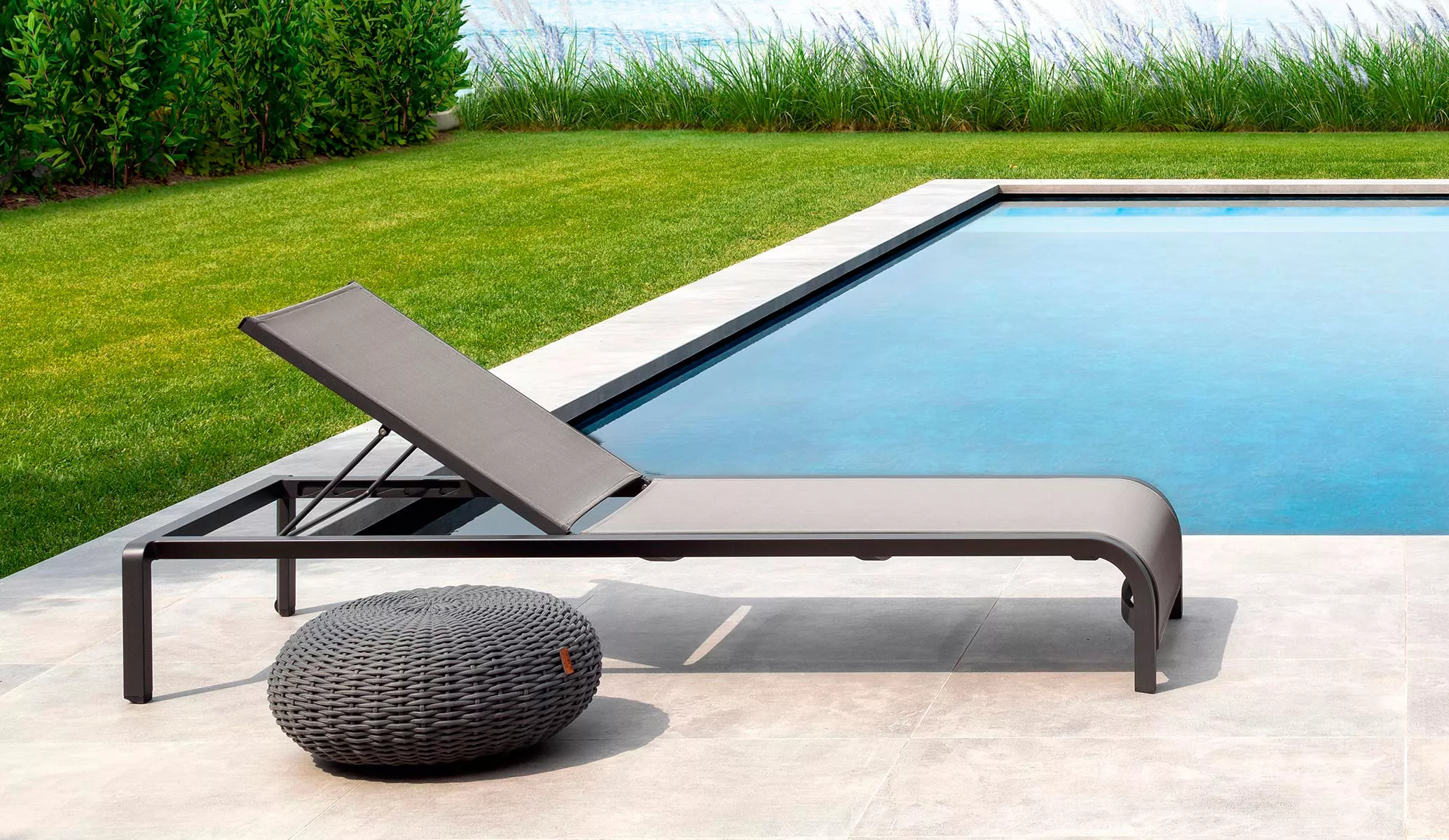 Das Gestell ist aus pulverbeschichtetem Aluminium, das in den Farben White, Dove und Graphite erhältlich ist. Die Bespannung der Sonnenliege ist der dazu passenden Farbe: