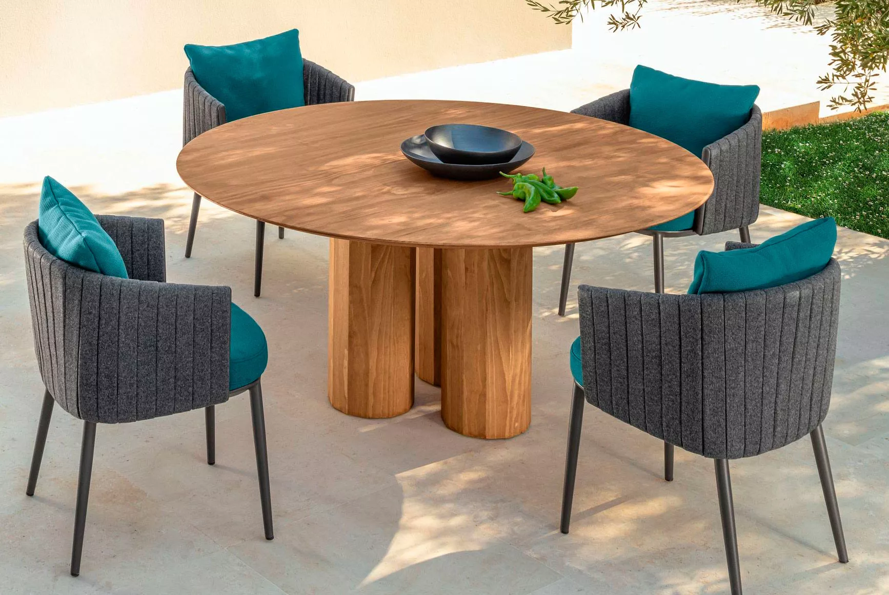 Talenti SALINAS Gartentisch 165 cm Der Salinas-Esstisch überträgt die für die Innenwelt typische Raffinesse ins Freie. Das unverwechselbare Design der Säulen, die ihn tragen, hebt die Textur des Holzes hervor und erinnert an den natürlichen Charme von Salinas, der Region Ibizas, die die gesamte Kollektion inspiriert hat.Die Kollektion Salinas von Talenti ist von der Naturregion Ibiza inspiriert. Ein Projekt, bei dem Talenti den Feinschliff, der typisch für die Indoor-Welt ist, im Außenbereich einführen wollte, indem die Distanz zwischen den beiden Umgebungen immer mehr verkürzt wird und sie zu einer Kontinuität gebracht werden. Die Kollektion besteht aus Sofas und Sesseln, bei denen das textile Komponente vorherrschend ist. Der gepolsterte Gürtel und die kostbaren Metall-Details, die am Ende der Rückenlehnen sichtbar sind, verleihen der Kollektion Charme und zeitlose Eleganz. Das dreisitzige Sofa Salinas drückt durch die Kostbarkeit der Stoffe die Raffinesse aus, die typisch für die Indoor-Welt im Freien ist. Die raffinierte Farbpalette erinnert an die Farben von Sand und Meer und verleiht dem Außenbereich einen natürlichen zeitlosen Charme. Die weichen Linien der Kissen werden durch die Verwendung des gepolsterten Trägers im Rücken betont, der zu einem Designelement wird. Ein Möbelstück, das Kontinuität zwischen Innen- und Außenbereich bietet. Alle Artikel zeichnen sich durch eine pulverbeschichtete Aluminiumstruktur in zwei verschiedenen Farben aus: Weiß (A12) oder Graphit (A14). Arten von Stoff: Weiß-Beige (C123) für die weiße Version und Weiß-Beige (C123), Mambo-Perle (C5) oder Deep Ocean (C138) für die Graphitversion. Der Stoff Deep Ocean ist umweltfreundlich und besteht zu 100% aus recyceltem PET. Kissen aus Stoff, abnehmbar, einfach zu waschen und wetterbeständig. Schnell trocknendes Schaumstoffpolster. Es stehen zwei verschiedene Optionen für den Esstisch und den Couchtisch zur Verfügung: in Accoya-Holz in natürlicher Teakfarbe oder in Beige (S30) oder Grau (S31) Zement. Wir empfehlen, damit ihre Möbelstücke viele Jahrzehnte überstehen, die Möbel trotz ihrer Wetterbeständigkeit mit einer Schutzhülle gegen Regen und Schnee zu schützen. Produkteigenschaften Gestell / Tischplatte: Zement Maße: Ø165 × H74 cm Gewicht: 195 kg Wir sind exklusiver Händler von Talenti - Outdoor Living. Falls Sie einen Artikel nicht bei uns im Online-Shop finden, zögern Sie nicht uns zu kontaktieren. Wir können Ihnen die gesamte Talenti-Kollektion bestellen.
