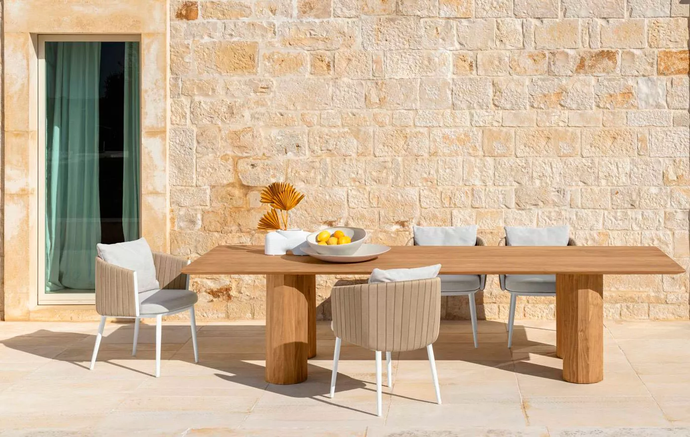 Der Salinas-Esstisch hat ein raffiniertes Design, das den Rohstoff ausnutzt und die Textur des Holzes hervorhebt. Er verleiht der äußeren Umgebung, in die er eingefügt wird, Charme und Eleganz und erinnert an die Atmosphäre von Salinas, der naturalistischen Region Ibizas, von der er sich inspirieren lässt. Der Salinas-Esstisch überträgt die für die Innenwelt typische Raffinesse ins Freie.