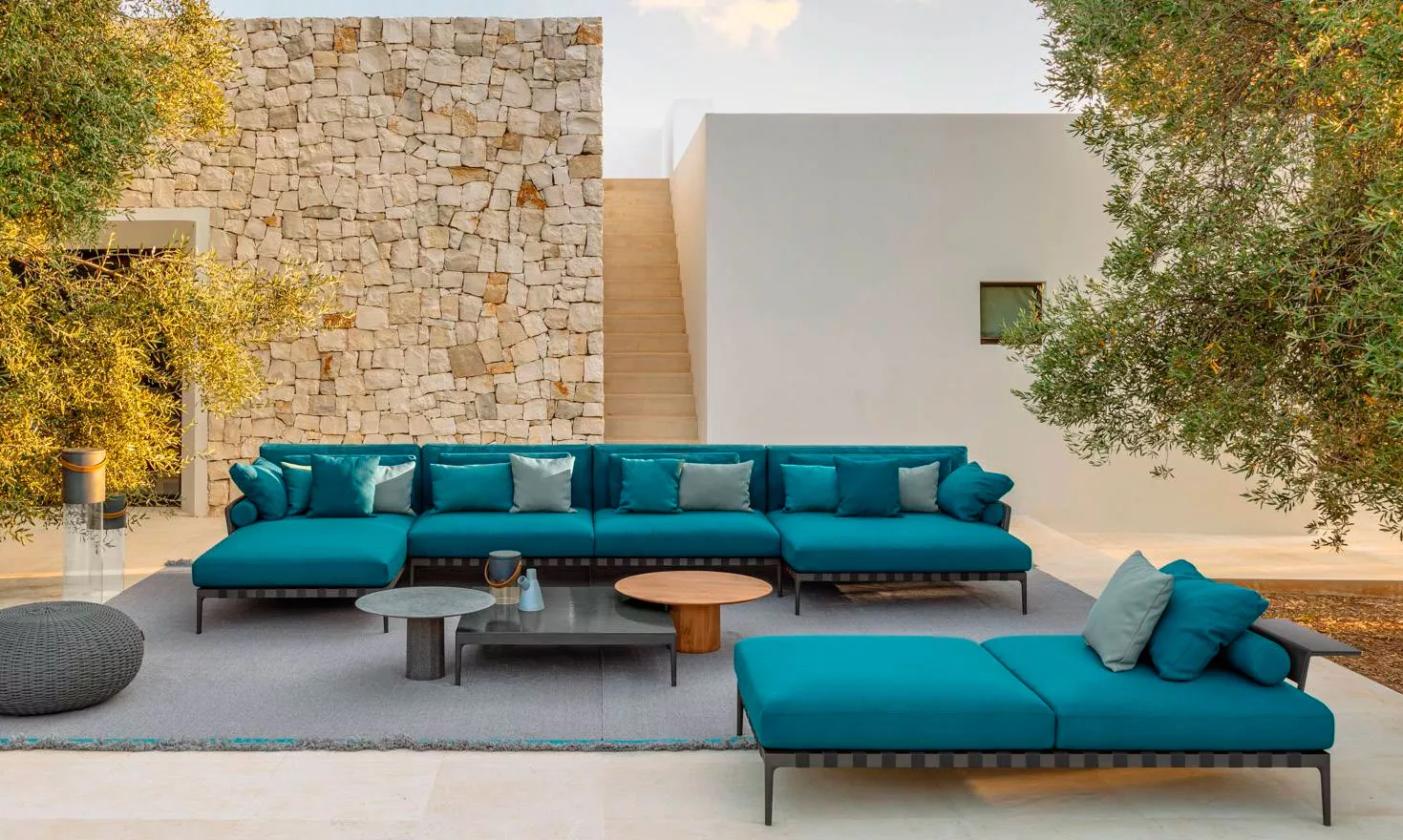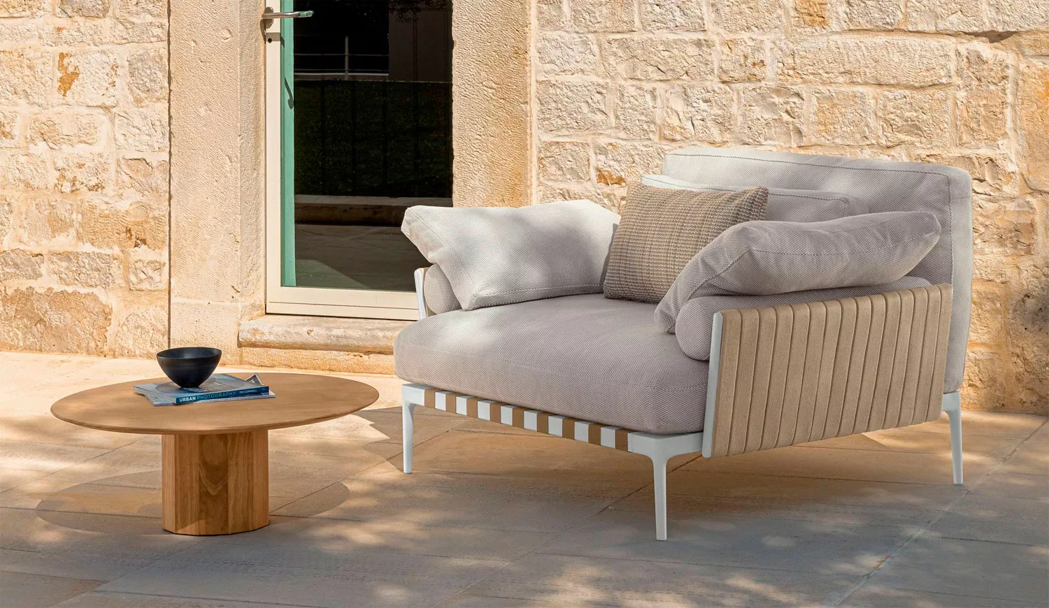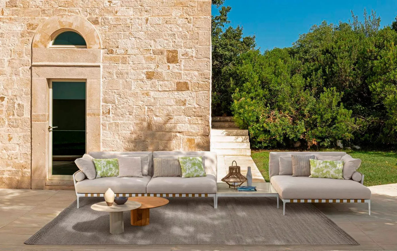 Die Kollektion Salinas von Talenti ist von der Naturregion Ibiza inspiriert. Ein Projekt, bei dem Talenti den Feinschliff, der typisch für die Indoor-Welt ist, im Außenbereich einführen wollte, indem die Distanz zwischen den beiden Umgebungen immer mehr verkürzt wird und sie zu einer Kontinuität gebracht werden. Die Kollektion besteht aus Sofas und Sesseln, bei denen das textile Komponente vorherrschend ist. Der gepolsterte Gürtel und die kostbaren Metall-Details, die am Ende der Rückenlehnen sichtbar sind, verleihen der Kollektion Charme und zeitlose Eleganz.Produkteigenschaften