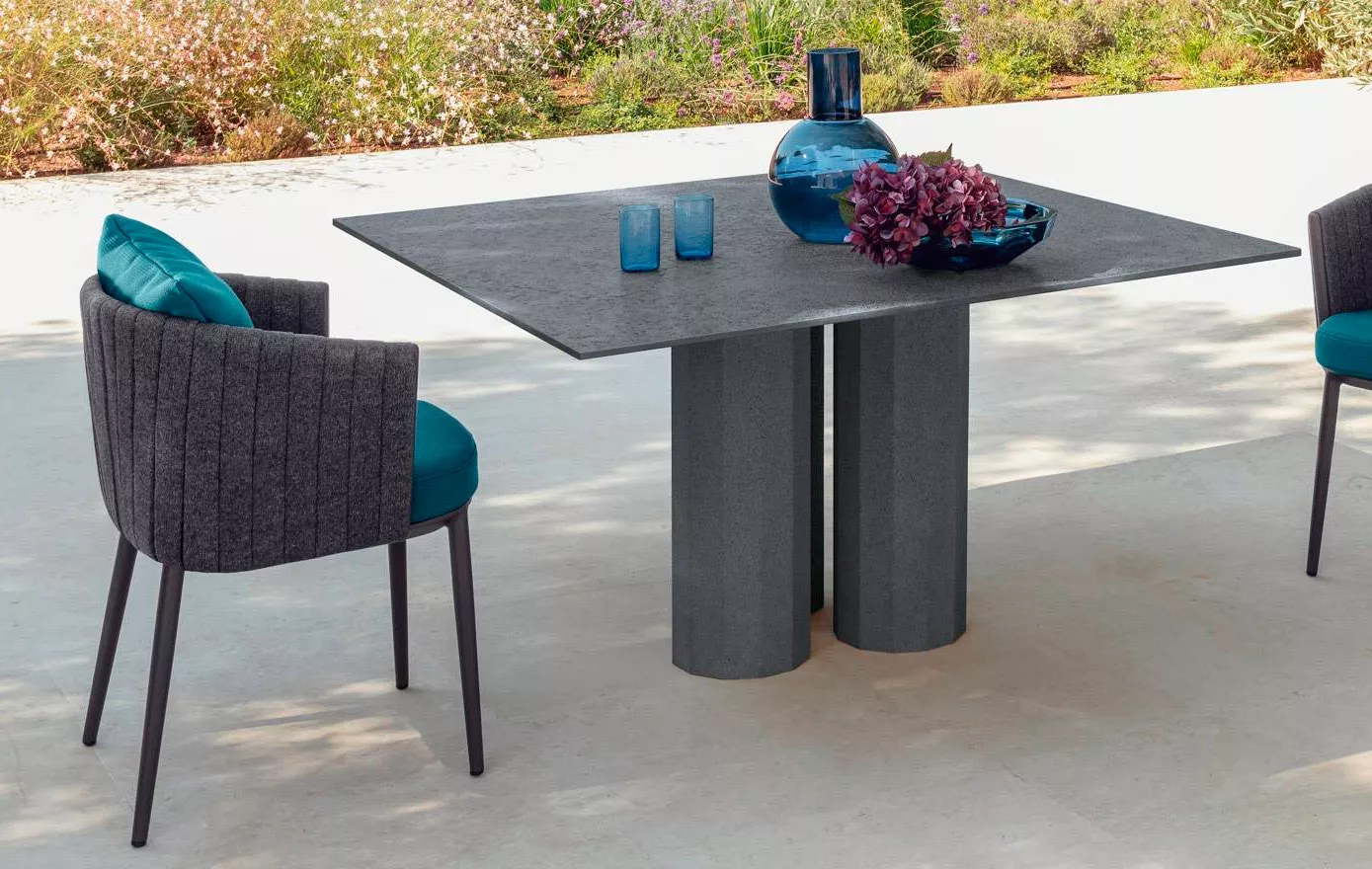 Der Salinas-Esstisch überträgt die für die Innenwelt typische Raffinesse ins Freie. Das unverwechselbare Design der Säulen, die ihn tragen, hebt die Textur des Holzes hervor und erinnert an den natürlichen Charme von Salinas, der Region Ibizas, die die gesamte Kollektion inspiriert hat.