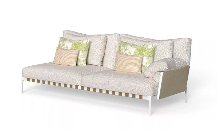 Das dreisitzige Sofa Salinas drückt durch die Kostbarkeit der Stoffe die Raffinesse aus, die typisch für die Indoor-Welt im Freien ist. Die raffinierte Farbpalette erinnert an die Farben von Sand und Meer und verleiht dem Außenbereich einen natürlichen zeitlosen Charme. Die weichen Linien der Kissen werden durch die Verwendung des gepolsterten Trägers im Rücken betont, der zu einem Designelement wird. Ein Möbelstück, das Kontinuität zwischen Innen- und Außenbereich bietet.