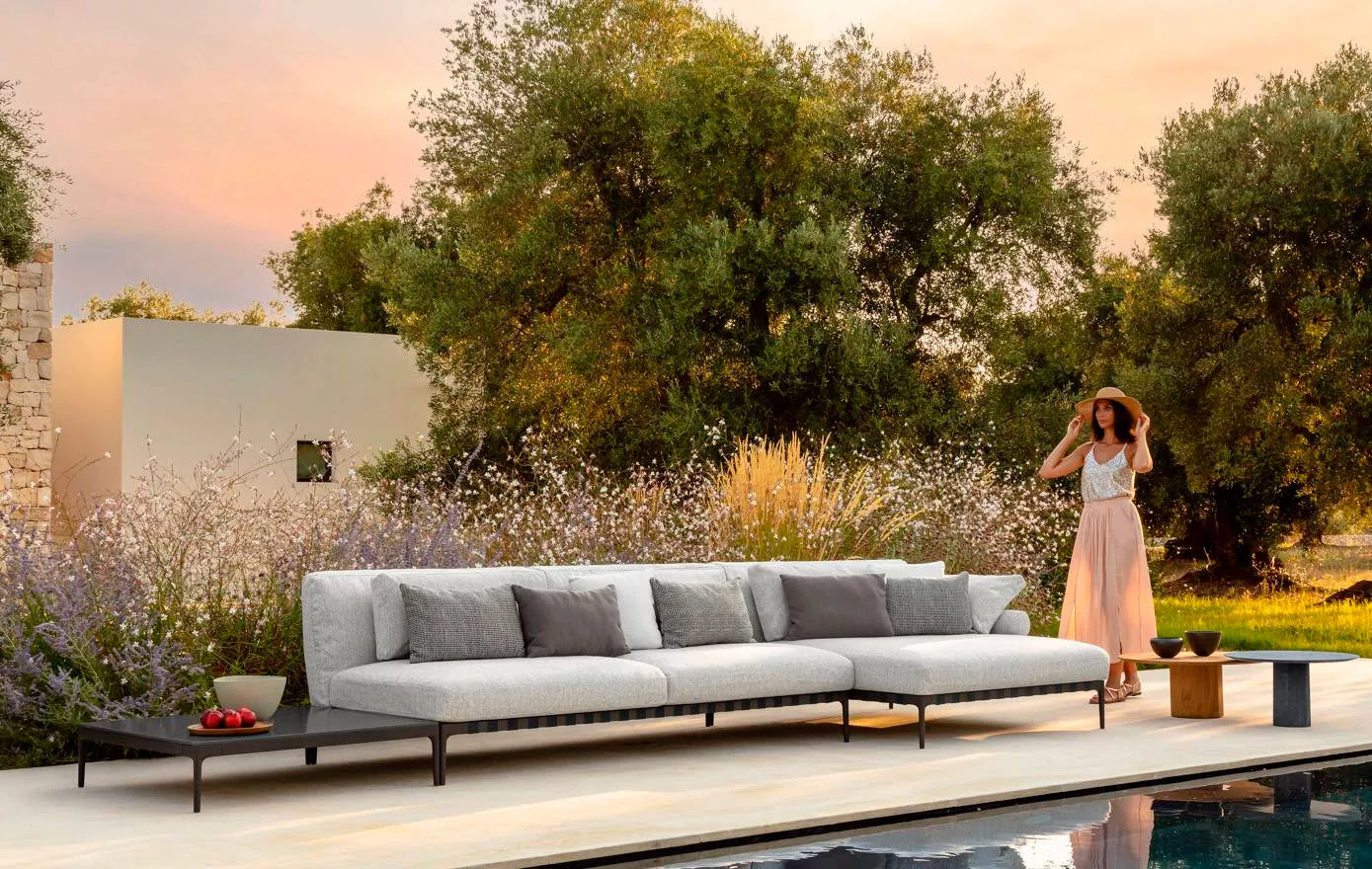Die Kollektion Salinas von Talenti ist von der Naturregion Ibiza inspiriert. Ein Projekt, bei dem Talenti den Feinschliff, der typisch für die Indoor-Welt ist, im Außenbereich einführen wollte, indem die Distanz zwischen den beiden Umgebungen immer mehr verkürzt wird und sie zu einer Kontinuität gebracht werden. Die Kollektion besteht aus Sofas und Sesseln, bei denen das textile Komponente vorherrschend ist. Der gepolsterte Gürtel und die kostbaren Metall-Details, die am Ende der Rückenlehnen sichtbar sind, verleihen der Kollektion Charme und zeitlose Eleganz.