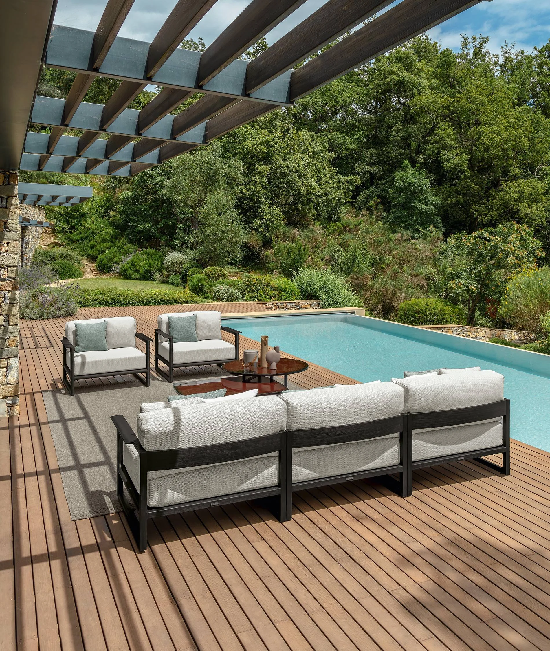 Talenti CLIFF Loungesessel • inklusive Sitzkissen Der Sessel aus der Kollektion Cliff zeichnet sich durch seine großzügige Sitzfläche aus, die in die unverwechselbare Form der Elemente der Kollektion integriert ist. Das charakteristische Kordelgeflecht, das für alle Möbelstücke der Kollektion typisch ist, verleiht dem Sofa eine spielerische Note und unterstreicht die Lust am Spiel, die die gesamte Linie Cliff auszeichnet. Die Rückenlehne besteht aus einem Alurahmen, in den synthetische Seilkordeln eingeflochten sind. Die Kollektion Cliff ist das Ergebnis einer Kombination moderner Materialien, die eine einzigartige Ausdrucksform schaffen. Cliff steht für die Extreme Vielseitigkeit. Geflochtene Seilkordeln und Outdoor Gewebe sind die besonderen Details, die der gesamten Kollektion einen einzigartigen Stil verleihen. Unterschiedliche Farbtöne und die modulare Struktur ermöglichen es, die Elemente zu unzähligen Kombinationen zusammenzusetzen. Das Kordelgeflecht der Module ist an eine Rohrkonstruktion aus Metall gebunden, welche in der gleichen Farbe lackiert ist wie das Polstergewebe und die Kordel. Bei der textilen Ausführung wird der Rahmen von einem Bezug aus Textilgewebe verdeckt. Der graphitfarbene Unterbau besteht aus pulverlackiertem Aluminium, während die Struktur der Rückenlehne ebenfalls aus Aluminium besteht und je nach Ausführung entweder mit Seilkordeln aus synthetischem Material umflochten oder mit einem abziehbaren Bezug überzogen ist.Alle Elemente haben einen graphitfarbenen Aluminiumrahmen. Die Rückenlehnen sind in zwei Größen erhältlich: H 90 cm oder H 70 cm. Die Rückenlehnen in H 90 cm sind mit einem synthetischen Kordelgeflecht in den Farben Beige (R9) oder Dunkelgrau (R10) bezogen. Die Rückenlehnen in H 70 cm haben abnehmbare Bezüge und sind mit wetterbeständigen Outdoor-Stoffen in den Farben Beige (C42), Dunkelgrau (C48), Blau (C50) und Grün (C102) bezogen. Die Sitzkissen haben ebenfalls abnehmbare Bezüge und sind mit den gleichen wetterbeständigen Outdoor-Stoffen in den Farben Beige (C42), Dunkelgrau (C48), Blau (C50) und Grün (C102) bezogen. Die Polsterung besteht aus schnelltrocknendem Schaumstoff. Wir empfehlen, damit ihre Möbelstücke viele Jahrzehnte überstehen, die Möbel trotz ihrer Wetterbeständigkeit mit einer Schutzhülle gegen Regen und Schnee zu schützen. Produkteigenschaften Gestell: Aluminium, pulverbeschichtet Sitzpolster aus "Quick Dry" Schaumstoff Kissenhöhe: 38 cmSitzhöhe: 44 cm Maße: B95 × T81 × H72 cm Gewicht: 32 kg Achtung: Dekokissen können separat erworben werden - nicht im Lieferumfang enthalten Wir sind exklusiver Händler von Talenti - Outdoor Living. Falls Sie einen Artikel nicht bei uns im Online-Shop finden, zögern Sie nicht uns zu kontaktieren. Wir können Ihnen die gesamte Talenti-Kollektion bestellen.