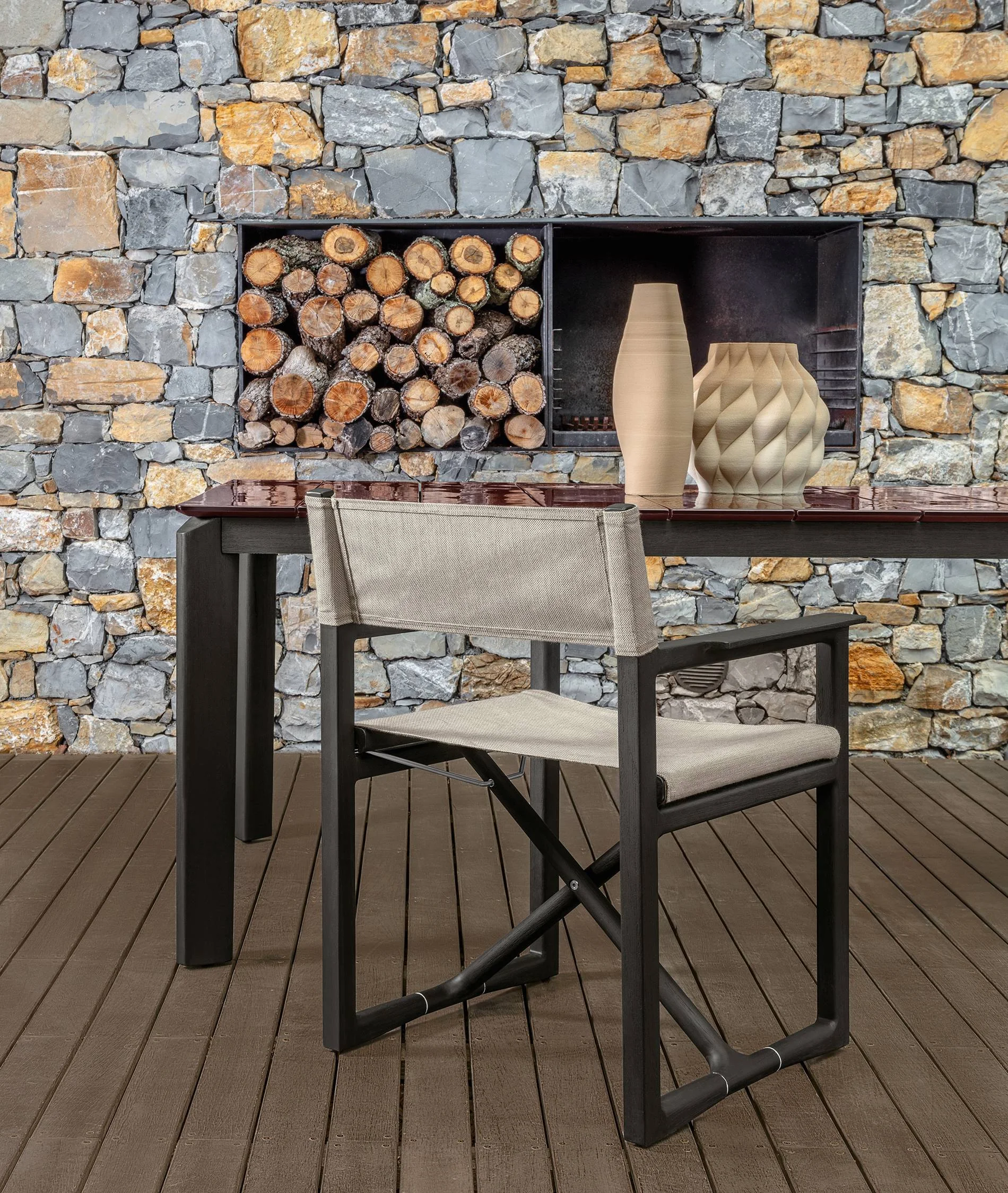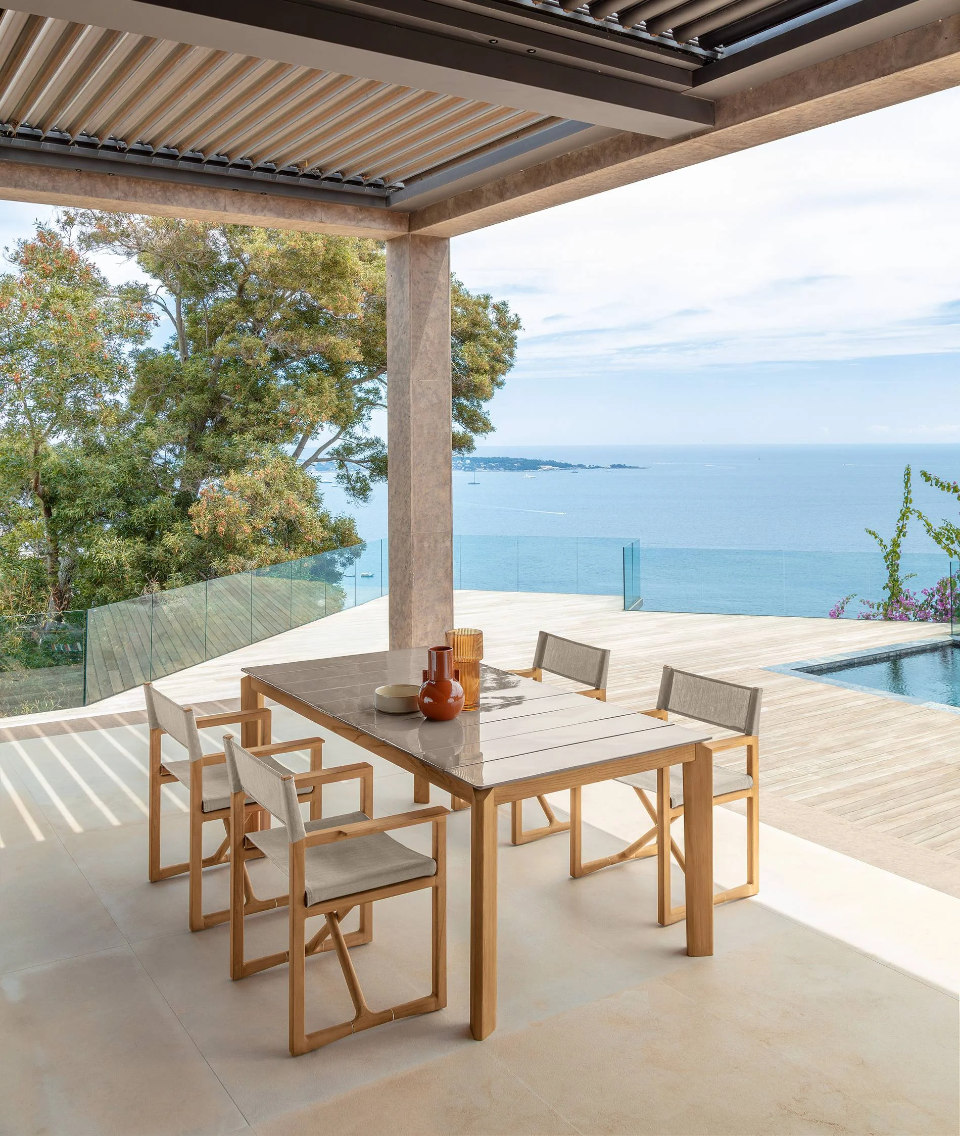 Die Rückenlehne und der Sitz fügen sich harmonisch in den warmen Naturton des Holzes ein und bieten hohen Komfort. Die überkreuzte Basisstruktur sowie die offenen Armlehnen verleihen dem Stuhl eine zeitlose Eleganz, während seine klappbare Funktion maximale Flexibilität ermöglicht. Ob im Garten, auf der Terrasse oder am Pool – der Thea Regiestuhl verbindet Ästhetik und Funktionalität auf perfekte Weise.