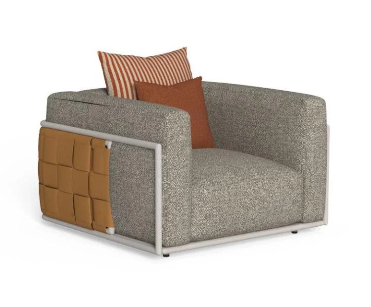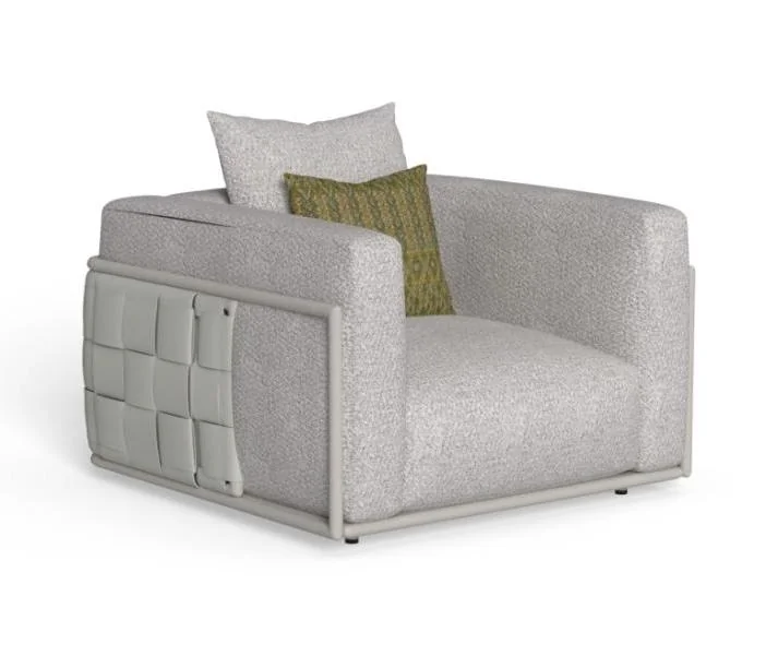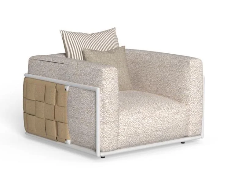 Sein besonderes Design wird durch die hochwertigen geflechteten Kunstlederbänder an der Rückenlehne betont, die kunstvoll auf einer handbeschichteten Aluminiumrohrstruktur verarbeitet sind. Diese handwerkliche Fertigung verleiht dem Sessel einen einzigartigen Charakter und setzt stilvolle Akzente in jedem Außenbereich.