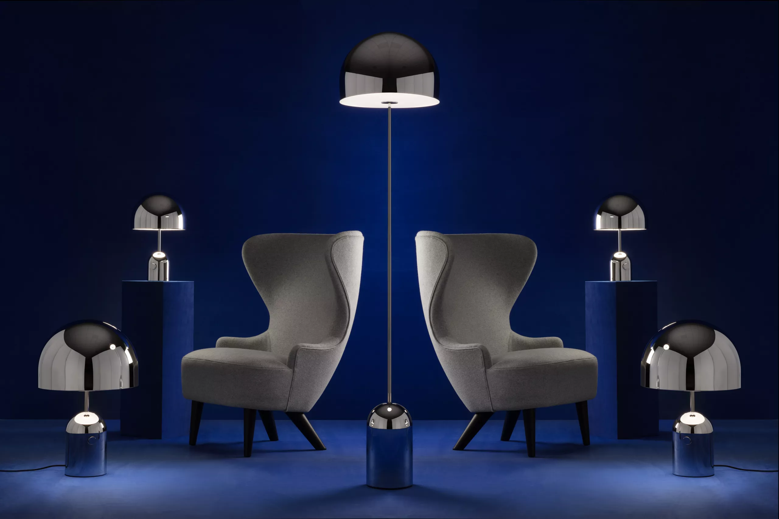 Bell verkörpert das Prinzip der Reduktion, entstanden aus sorgfältig geformtem Stahl und anschließend veredelt mit Oberflächenbeschichtungen aus Messing, Kupfer, Chrom, irisierendem PVD-Blau und glänzendem Schwarz. Die spiegelnde Beschaffenheit von Bell erlaubt es ihr, die Eigenschaften ihrer Umgebung anzunehmen.