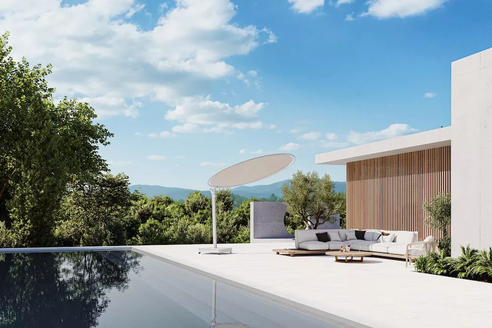 Futuristisches Sonnensegel, stufenlos verstellbar.