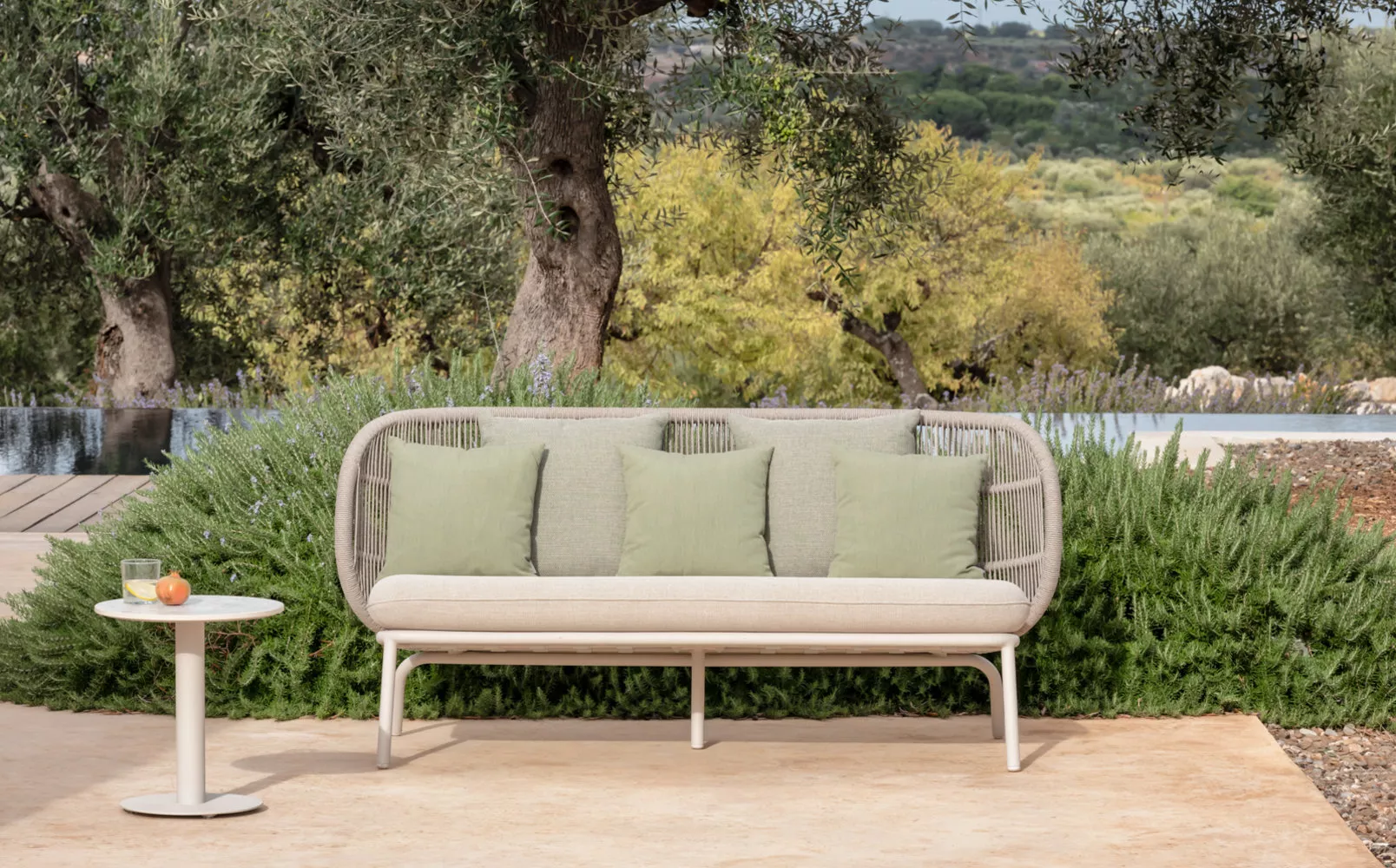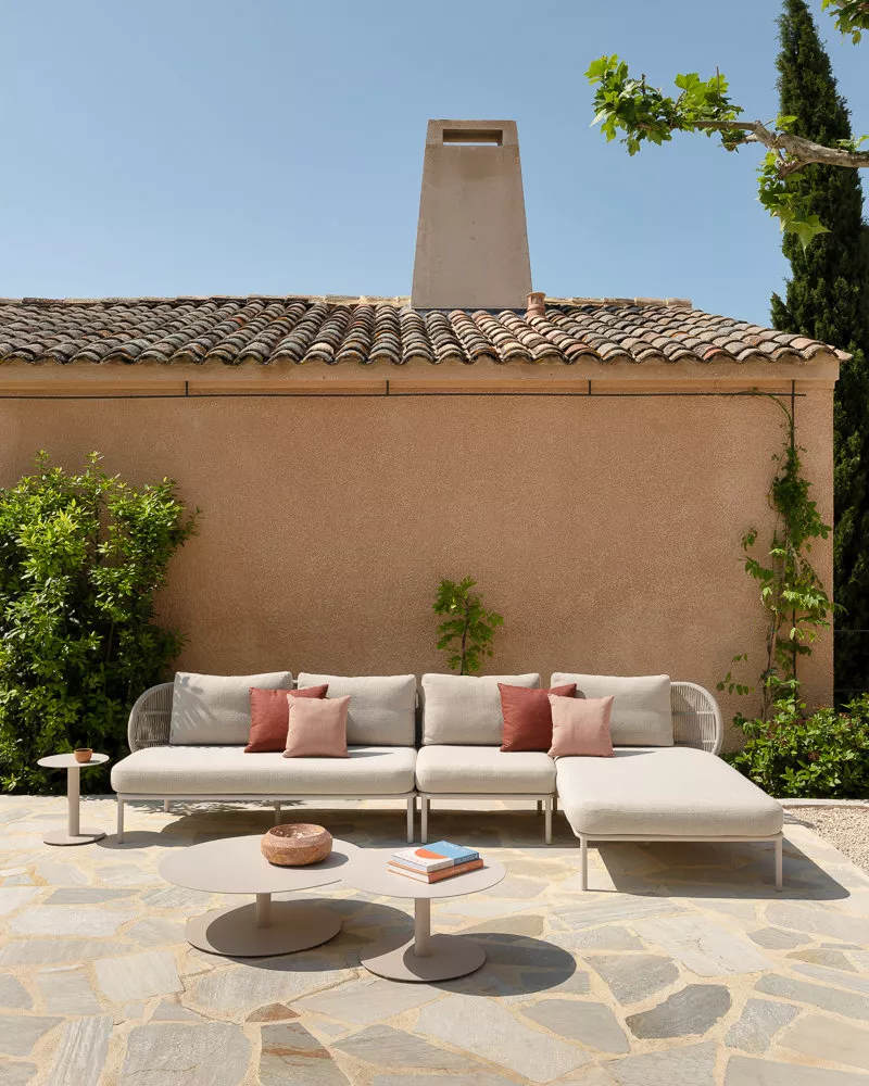 Inspiriert von den vielseitigen Möglichkeiten, verschiedene Materialien in einzigartige Designs zu mischen, kreierten Studio Segers die Kodo-Kollektion. Naturkeramik, industrielles Aluminium und taktiles Acrylseil finden Verwendung in der gesamten Kollektion. Diese Materialien sind wetterbeständig und verleihen den Möbeln ein zeitgemäßes Gefühl, während die weichen Kurven und abgerundeten Rücken ein warmes und einladendes Ambiente ausstrahlen. Suchen Sie sich einen ruhigen Ort aus und entspannen Sie sich auf der bequemen Möbeln. Berühren, fühlen und erleben Sie das zarte Gewebe und die bequemen Kissen, während Sie drinnen oder draußen einen Drink genießen.