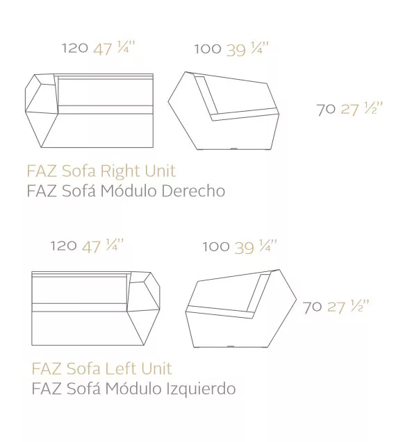 Vondom Faz Sofa, EckmodulDie von Ramón Esteve entworfene Kollektion Vondom Faz ist eine der emblematischsten Kollektionen des Unternehmens. Sie besticht durch ihr modulares Design und ihre Raffinesse und verkörpert Harmonie, Ruhe und Zeitlosigkeit durch mineralische und markante Formen. Faz verwandelt Umgebungen durch die einzigartige Kombination von Material und Licht und schafft so eine einhüllende und exklusive Atmosphäre. Maße (B × T × H) 120 × 100 × 70 cm Eigenschaften der Beleuchtungsvarianten: LED weiss (ausschließlich weiße Beleuchtung): - weiße LEDs 4000 - 4500 Kelvin- 720 - 2800 LM Max. (je nach Modell)- 16 - 72 W Max. (Modelle je nach Verfügbarkeit)- Netzgerät: 100-240 Volt / 50-6 0Hz- Energieeffizienzklasse: A- Schutzklasse: IP65 / für feuchte Bereiche geeignet.- 5 m langes, weißes Kabel LED-RGB: - Vielfarbige RGB-LEDs, 3 Weißtöne und 9 Farben (dunkelblau, hellblau, dunkelgrün, hellgrün, lila, flieder, rot, orange, gelb)- Farbwechsel durch Fernbedienung (433,92 MHz) / Reichweite: 10-15 m- 450 - 1100 LM Max. (je nach Modell)- 16 - 72 W Max. (je nach Modell)- Netzgerät: 100-240 Volt / 50-6 0Hz- Energieeffiziensklasse: A- Schutzklasse: IP65 / für feuchte Bereiche geeignet.- 5 m langes, weißes Kabel LED-RGB mit Akku: - Vielfarbige RGB-LEDs, 3 Weißtöne und 9 Farben (dunkelblau, hellblau, dunkelgrün, hellgrün, lila, flieder, rot, orange, gelb)- Farbwechsel durch Fernbedienung (433,92 MHz) / Reichweite: 10-15 m- 450 - 1100 Lumen Max. (je nach Modell)- 16 - 72 W Max. (je nach Modell)- inkl. Li-Ion-Batterie 5,2 V 19 Ah (Ladedauer: 4 Stunden, Betriebsdauer 5-6 Stunden, 500 Ladezyklen)- 19 Ah (je nach Verfügbarkeit) 12 V / 5-6 Stunden Autonomie/ Ladezeit 4 Stunden- 500 Zyklen / IN: 100-240 V AC / 50-60 Hz- Energieeffiziensklasse: A- Schutzklasse: IP65 / für feuchte Bereiche geeignet. RGB-LED mit WiFi (DMX - mit/ohne Akku): DMX ist ein digitales Steuerungsprotokoll, das in der Bühnen- und Veranstaltungstechnik zur Steuerung von der Lichttechnik eingesetzt wird. Es ermöglicht das Steuern einer oder mehrerer Leuchten über eine Steuereinheit. Für die Steuerung über WiFi ist ein Transmitter notwendig, der nicht im Lieferumfang enthalten ist. Sie haben die Möglichkeit zwischen zwei verschiedenen Transmittern zu wählen: Home WIFI DMX: Access Point über den Sie alle VONDOM Produkte mit Ihren IOS oder Android Gerät steuern können. Professional XLR DMX: XRL mit dem Sie alle VONDOM Produkte über ein Mischpult oder Computer steuern können. Sie benötigen nur einen Transmitter für die Steuerung Ihrer gesamten VONDOM Möbel, Pflanzgefäße und Leuchten.