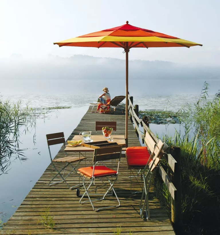 Der Sonnenschirm kann jedem Ambiente angepasst werden. Bei der Verwendung von Schirmtischen, bzw. Bodenplatten kann man so die Länge des Schirmstammes verstellen, um den Schirm den Gegebenheiten anzupassen. Zudem ist es bei manchen Modellen möglich, Knickmechanismen einbauen zu lassen, um den Umgang mit dem Sonnenschirm Klassiker von Weishäupl noch flexibler zu gestalten.