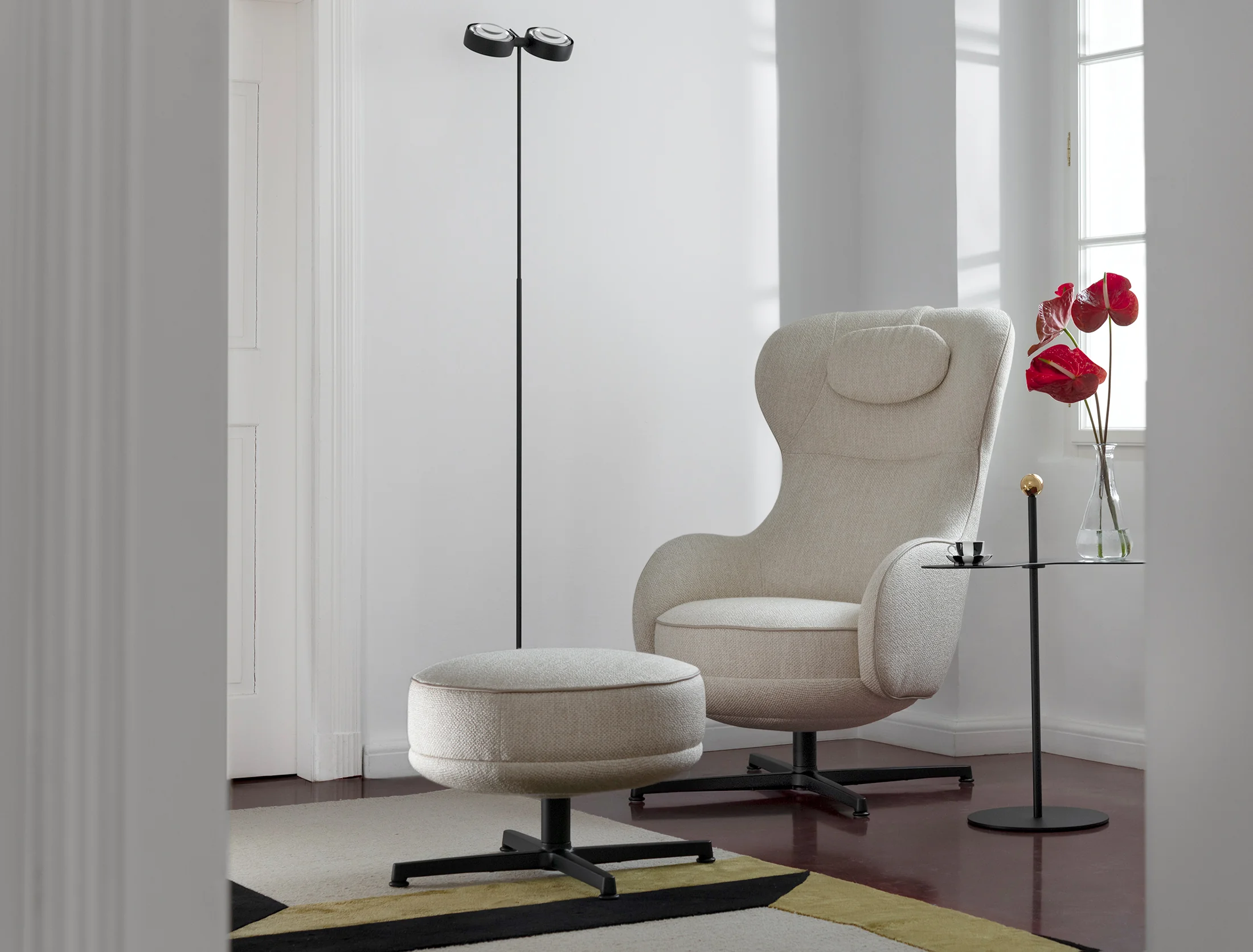 - Füße: Aluminium Black Grey mit schwarzen Fußabschlüssen und Filzgleitern, auf Wunsch Aluminium poliert