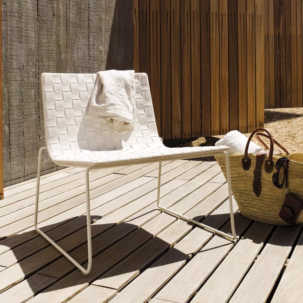 Andreu World Trenza Kollektion mit einem Stahlgestell und Bandgeflecht ist für den Außeneinsatz bestens geeignet. Sie strahlt ein hohes Maß an Luxus aus und bietet dank ihrem einzigartig geflochtenen Band einen zusätzlichen Komfort. Trenza passt sich problemlos an verschiedene Outdoor Umgebungen an, hat harmonische Proportionen und durchdachte Details, die sie originell machen. Geflechtgartenmöbel Trenza ist in drei Versionen erhältlich: Stuhl, Sessel sowie Sonnenliege. Das Bandgeflecht in den Farben Terra Brown, Sand, Graphit und Weiß erleichtert die Belüftung, ohne auf Komfort zu verzichten. Der Metallrahmen ist mit EPL-5 behandelten Stahl in Weiß oder Erde Brown ausgeführt. Trenza's modernes Design betont den luftigen Charakter dieser Kollektion. Um den Komfort zu vervollständigen, können Sie Ihre Trenza Loungegruppe mit den Outdoorkissen Ihrer Wahl kombinieren.