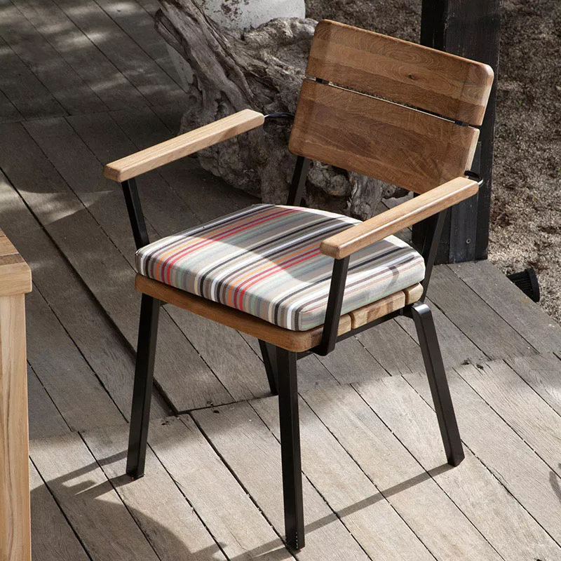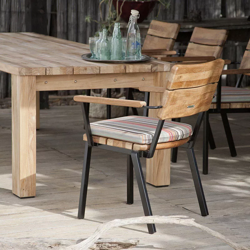 Die Titan Kollektion erweitert sich in 2015 um 3 zusätzlichen Artikel (Armstuhl, Bank und Tisch), die ein perfektes Beispiel der Verbindung von rustikalem Teak-Holz und pulverbeschichtetem Aluminiumgestell sind. Rustikale Kollektion charakterisiert sich durch die variable Maserung, was ein vorsätzliches Element des Entwurfes ist. Die Titan-Reihe ist ein Teil von unserer rustikalen Kollektion, die Teak-Holz in einer variablem Maserung zeigt. Diese Eigenschaft ist ein Element des Entwurfes und gilt als kein Produktdefekt. Die schwarzen Stützrahmen der Möbel wurden aus pulverbeschichtetem Aluminium gefertigt.