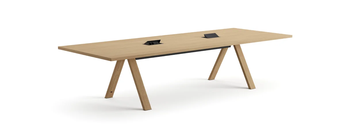 Die Position der Beine kann wahlweise bündig mit der Tischkante oder mit einem Abstand von 60 cm gewählt werden. Mit einer Höhe von 74 cm eignet sich der Tisch ideal für Büros, Konferenzräume und Home-Office-Bereiche.