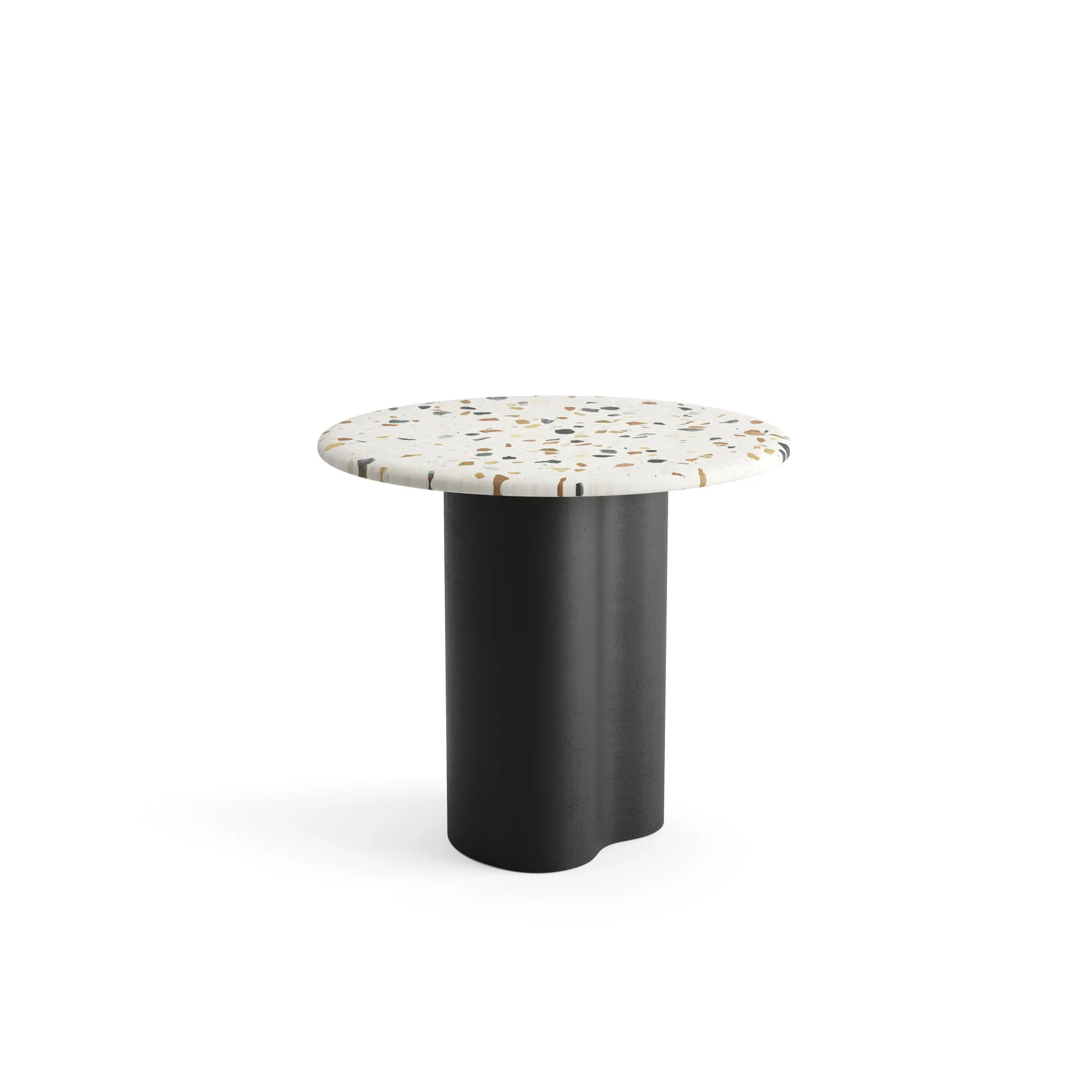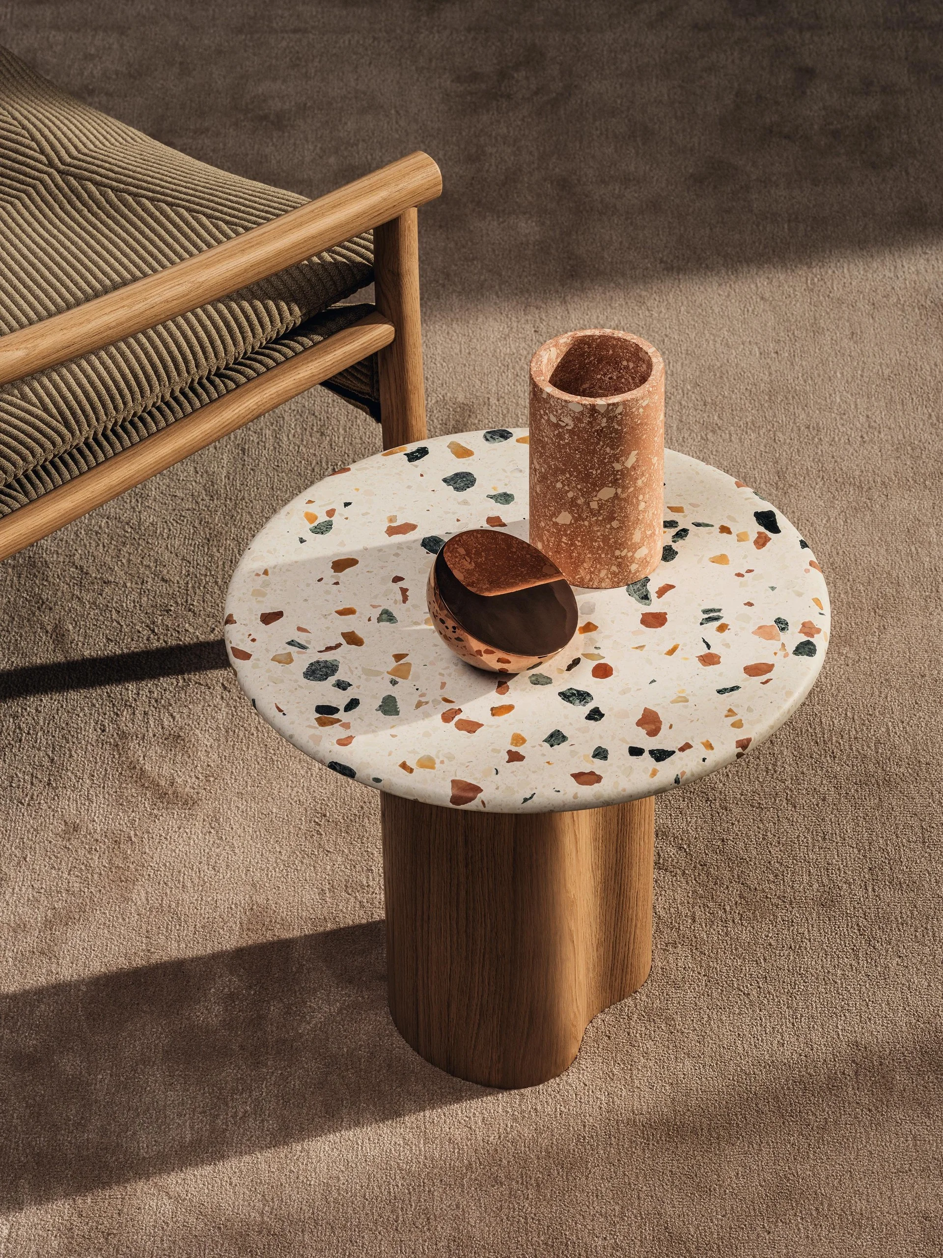 Die runde Tischplatte aus venezianischem Terrazzo (2 cm dick) verleiht dem Tisch eine individuelle und elegante Optik. Mit einer Höhe von 45 cm eignet sich der Tisch ideal als Beistelltisch neben Sofas, Sesseln oder Betten und setzt gleichzeitig einen stilvollen Akzent