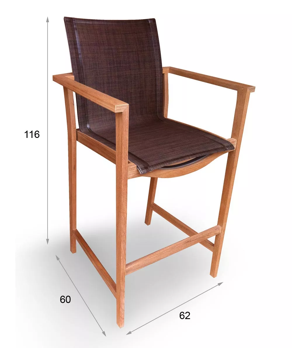Dieser Barhocker, mit einem kompromisslosen Sitzkomfort, besticht durch die elegante Zusammenstellung der hochwertigsten Materialien: Teakholz der Güteklasse „A“, eine Sitz und Rückenbespannung aus original Batyline®-Gewebe und Edelstahlkomponenten.