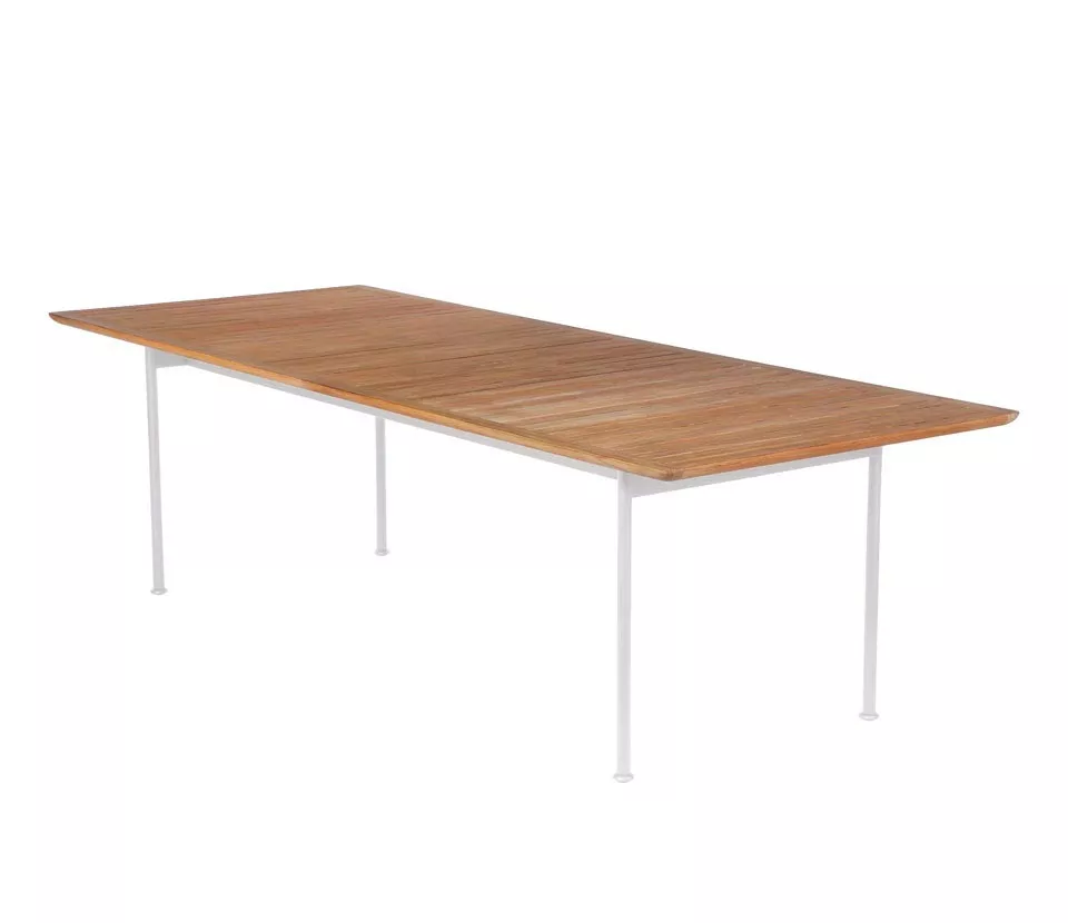 Esstisch • Gartentisch Layout mit Teakholz Tischplatte (belattet) und einem Gestell aus Edelstahl pulverbeschichtet in den Farben Forge Grey oder Arctic White.