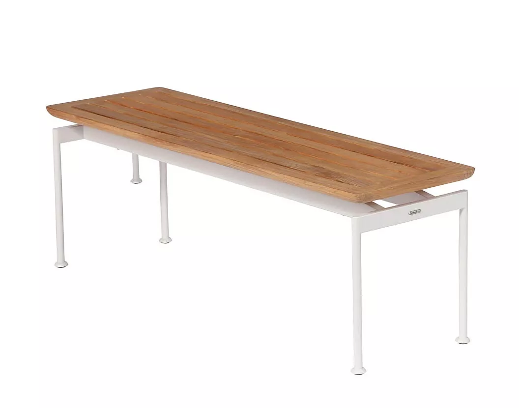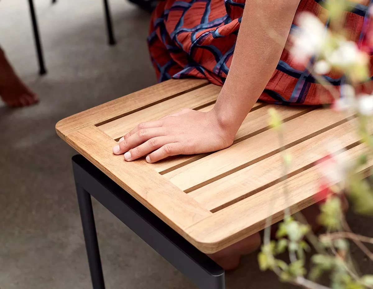 Gartenbank • Outdoor Bank Layout mit Teakholz Tischplatte (belattet) und einem Gestell aus Edelstahl pulverbeschichtet in den Farben Forge Grey oder Arctic White.