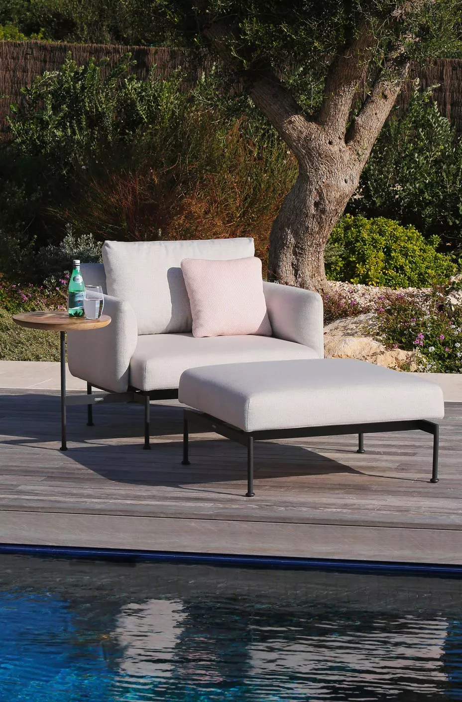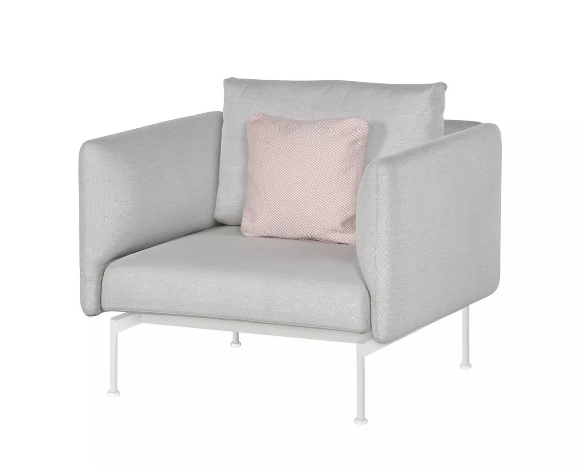 Loungesessel Layout mit Bespannung aus Sunbrella® und einem Gestell aus Edelstahl pulverbeschichtet in den Farben Forge Grey oder Arctic White.
