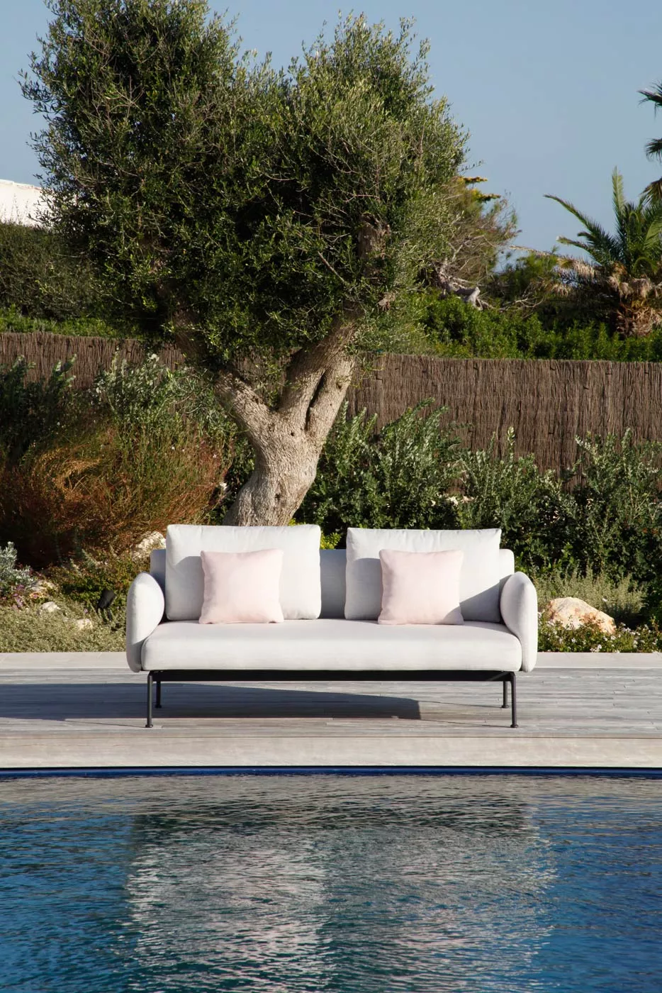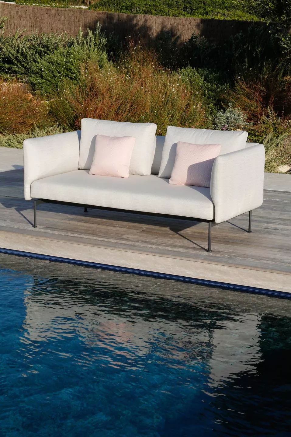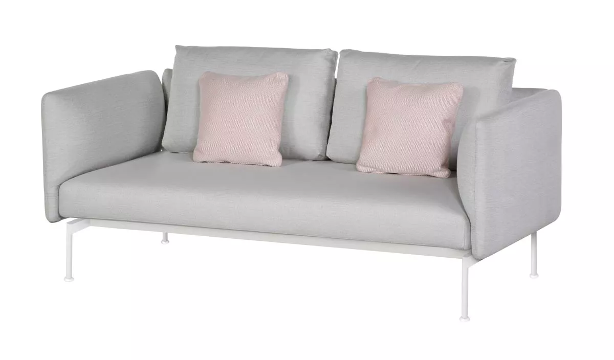 Loungesofa Zweisitzer Layout mit Bespannung aus Sunbrella® und einem Gestell aus Edelstahl pulverbeschichtet in den Farben Forge Grey oder Arctic White.