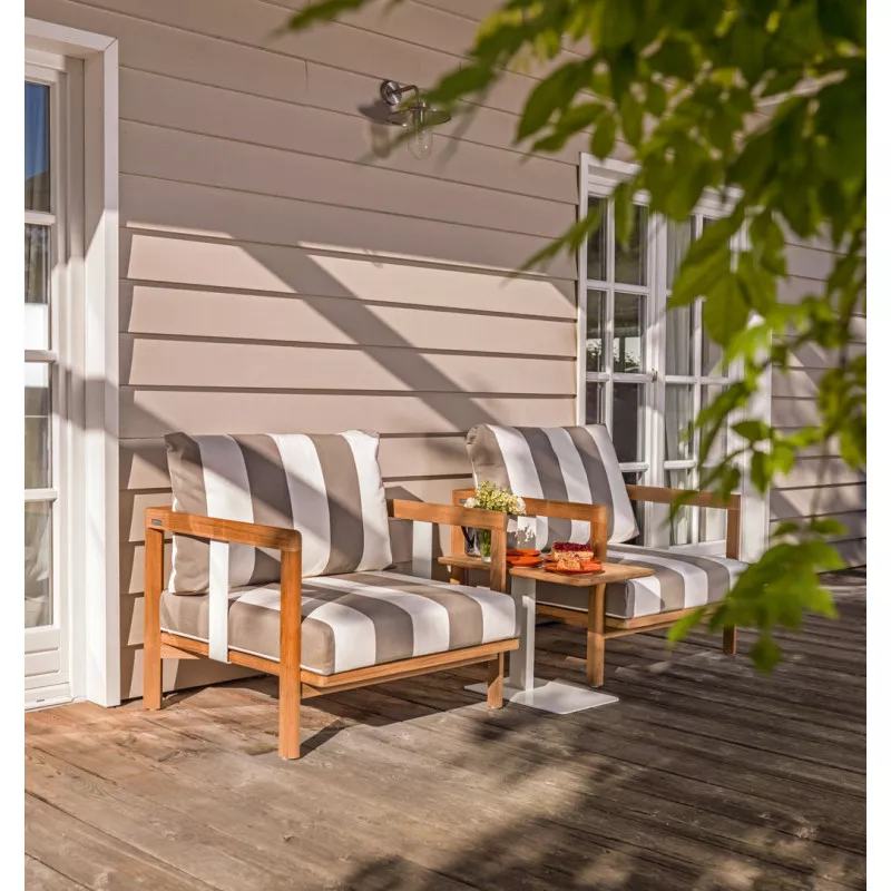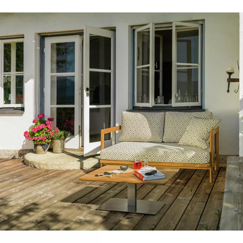 Weishäupl New Hampton Zweisitzer-Anbauelement | L+RDas Lounge-Programm Weishäupl New Hampton besticht durch klare Formen in Verbindung mit erstklassigen Materialien, die New Hampton seinen zeitlosen, geradlinigen Charakter verleihen. Das handwerklich gearbeitete Teakgestell wird durch pulverbeschichtete Metallwangen in Weiß oder Anthrazit ergänzt. Die Polsterbezüge aus unserem bewährten Polyacrylgewebe sind in einer breiten Farbpalette erhältlich. Für eine individuelle Gestaltung stehen neben einem klassischen 3-Sitzer Sofa und einem Einzelsessel verschiedene Elemente zur Wahl. New Hampton kann durch verschiedene Elemente zu einem Ensemble angeordnet werden. Beistelltische runden das Programm ab. New Hampton eignet sich für den Innen- und geschützten Außenbereich im privaten wie öffentlichen Raum. Ob Wohnzimmer, Hotel-Lobby oder Terrasse – New Hampton passt sich verschiedenen Umgebungen an. Hochwertiges Teakholz Polster mit Acrylstoff Bezug Ganzjährig wetterfest Leicht zu reinigenArmlehne links oder rechts (davorstehend) Maße (B × T × H): 144 × 86 × 64 cm Gestell: Teak massiv unbehandelt Sitz-Polster: Herausnehmbare, vliesummantelte Kaltschaumfüllung Sitzhöhe: 40 cm Gewicht: 25 kg