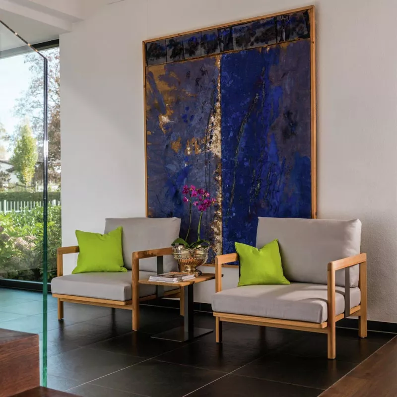 Weishäupl New Hampton Sessel Das Lounge-Programm Weishäupl New Hampton besticht durch klare Formen in Verbindung mit erstklassigen Materialien, die New Hampton seinen zeitlosen, geradlinigen Charakter verleihen. Das handwerklich gearbeitete Teakgestell wird durch pulverbeschichtete Metallwangen in Weiß oder Anthrazit ergänzt. Die Polsterbezüge aus unserem bewährten Polyacrylgewebe sind in einer breiten Farbpalette erhältlich. Für eine individuelle Gestaltung stehen neben einem klassischen 3-Sitzer Sofa und einem Einzelsessel verschiedene Elemente zur Wahl. New Hampton kann durch verschiedene Elemente zu einem Ensemble angeordnet werden. Beistelltische runden das Programm ab. New Hampton eignet sich für den Innen- und geschützten Außenbereich im privaten wie öffentlichen Raum. Ob Wohnzimmer, Hotel-Lobby oder Terrasse – New Hampton passt sich verschiedenen Umgebungen an. Hochwertiges Teakholz Polster mit Acrylstoff Bezug Ganzjährig wetterfest Leicht zu reinigen Maße (B × T × H): 89 × 86 × 64 cm Gestell: Teak massiv unbehandelt Sitz-Polster: Herausnehmbare, vliesummantelte Kaltschaumfüllung Sitzhöhe: 40 cm Gewicht: 18 kg