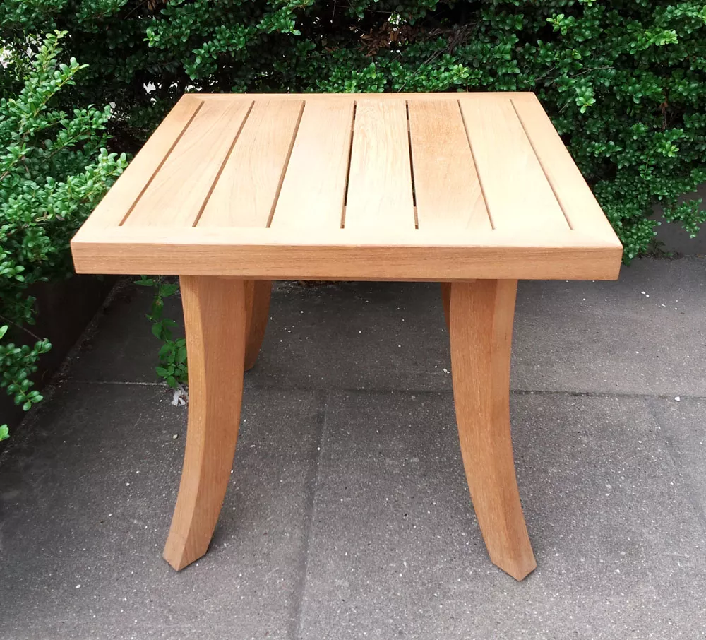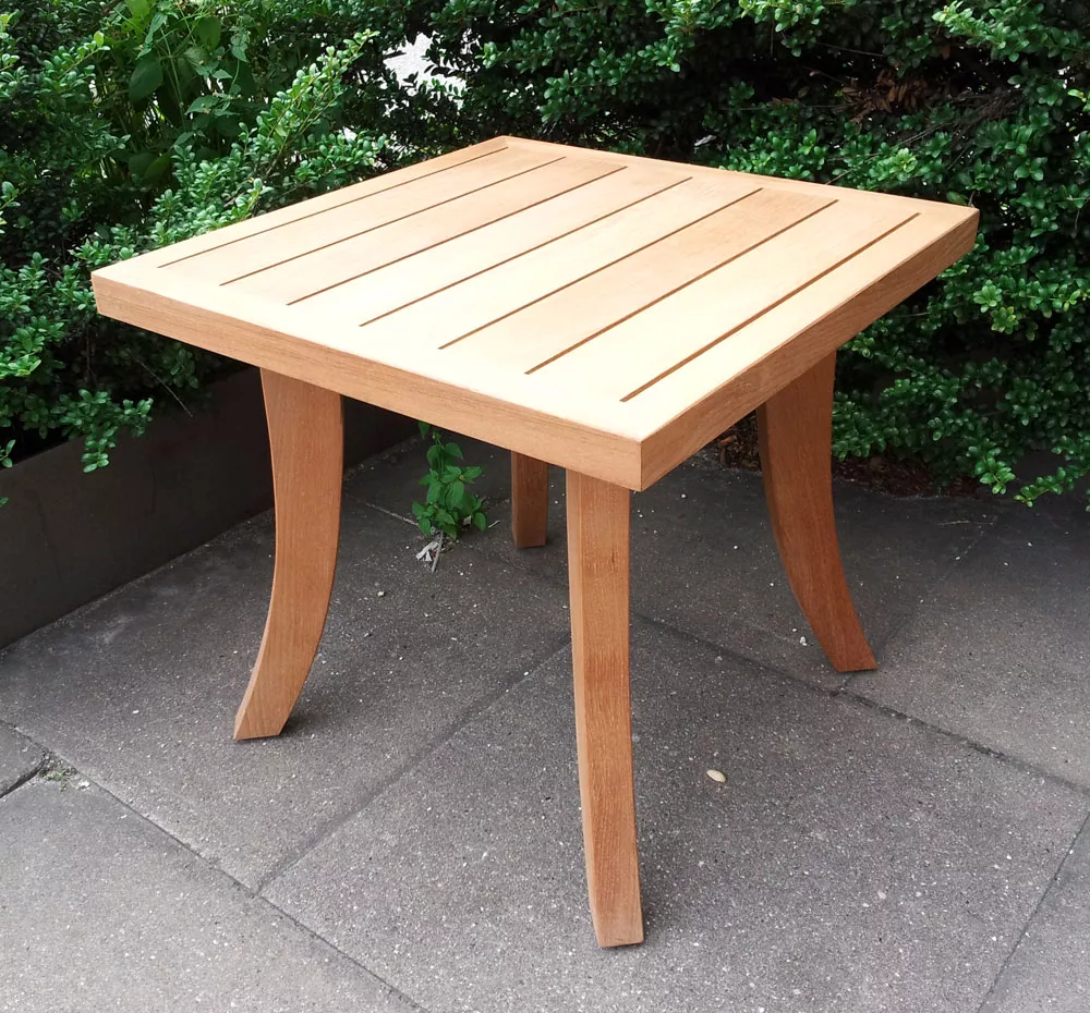 Der quadratische Nizza Beistelltisch von Royal Mirage besticht durch sein elegantes Design und den edlen Materialmix aus massivem Teakholz und hochwertigen Edelstahlkomponenten. Diese harmonische Kombination verleiht dem Tisch eine einzigartige Ästhetik, die sowohl robust als auch stilvoll wirkt. Dank der leicht nach außen gestellten Beinpfosten entsteht ein ausgewogenes und ansprechendes Gesamtbild, das sich nahtlos in jede Outdoor-Umgebung einfügt.